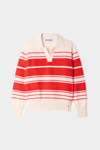 STRIPED KNIT LONSGLEEVE POLO / off white & acid red