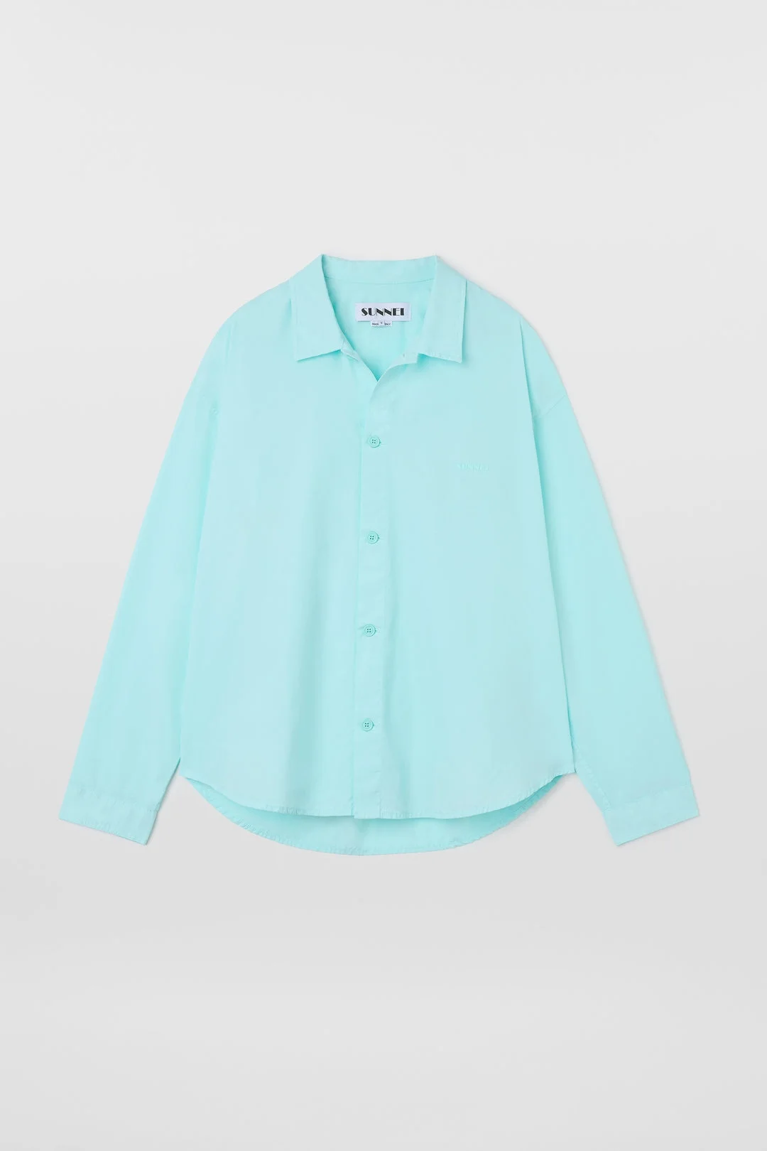 Over fit shirt in light blue compact poplin featuring tonal buttons at front and cuffs and SUNNEI gros grain loop on the centre back. 100%CO Materials from Italy Made in Italy Etienne is wearing a size M. Model measures: Height: 188cm Chest: 92cm Waist: 75cm Hips: 86cm Shoe: 44 Etienne is wearing a size M. Model measures: Height: 188cm Chest: 92cm Waist: 75cm Hips: 86cm Shoe: 44
