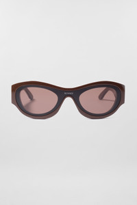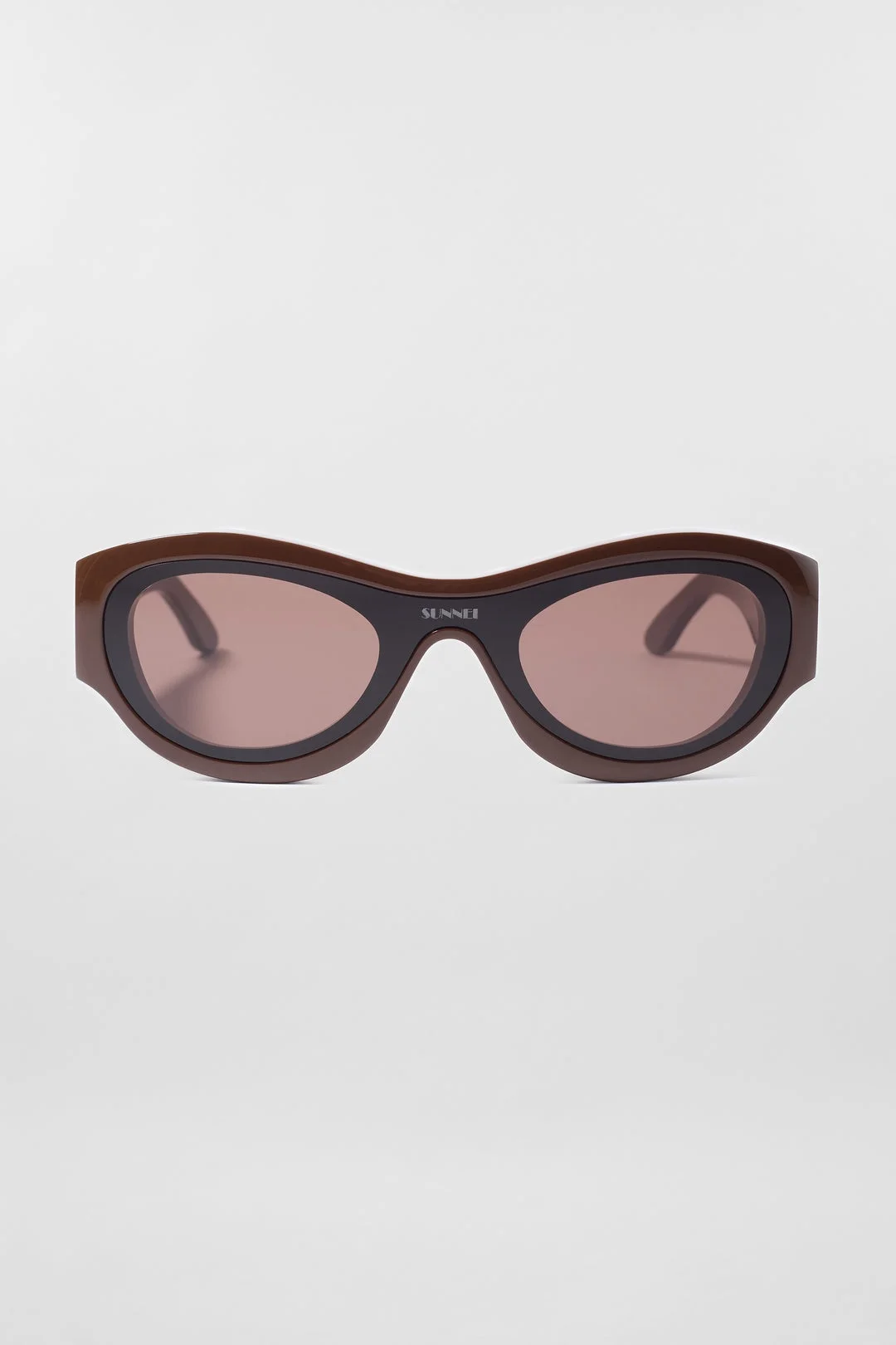 SUNNEI sunglasses featuring rounded lines and a single rounded-shape lens. Dark brown acetate and dark brown lens with lasered logo on front. Width:14 cm Height: 4.5 cm Temples lenght: 14.5 cm 100% ACETATE / 100% NYLON Materials from Italy Made in Italy