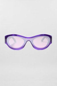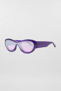 SUNNEI sunglasses featuring rounded lines and a single rounded-shape lens. Dark purple acetate and transparent lens with lasered logo on front. Width:14 cm Height: 4.5 cm Temples lenght: 14.5 cm 100% ACETATE / 100% NYLON Materials from Italy Made in Italy