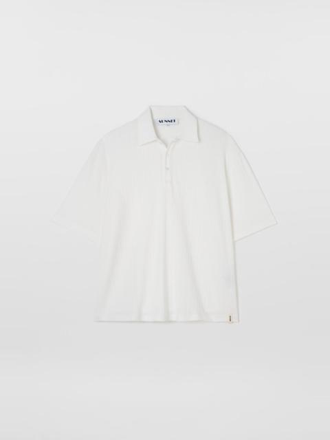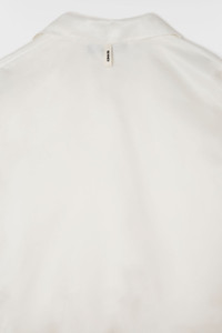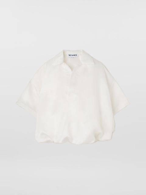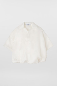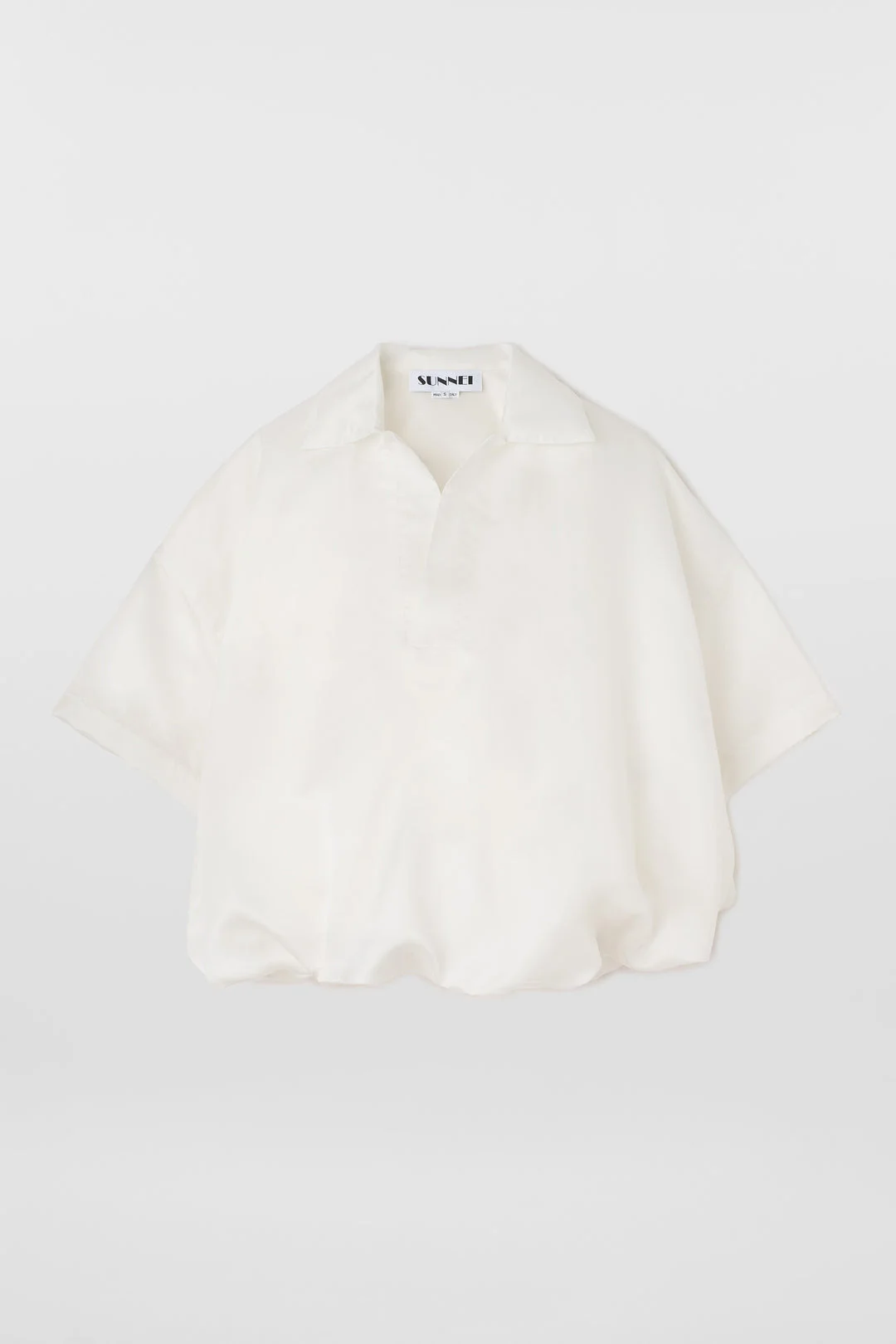 Shortsleeve polo with puffy bottom hem in sheer silk organza featuring SUNNEI loop on the centre back. 100% SI Changmho is wearing a size M. Model measures: Height: 187cm Chest: 84cm Waist: 65cm Hips: 87cm Shoe: 44