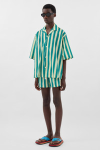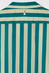 Shortsleeve shirt in a super light and breathable feather fabric featuring green and cream printed stripes with rubberized SUNNEI buttons on front and SUNNEI gros grain hoop on the centre back. Feather is the ultimate light fabric from Italy for men’s swimwear, offering exceptional elasticity, breathability, and quick-drying performance. Made from ultra-fine lycra, it ensures superior comfort, durability, and UV protection. 90%PA 10%EA Materials from Italy Made in Portugal Momo is wearing a size M. Model measures: Height: 187cm Chest: 75cm Waist: 63cm Hips: 85cm Shoe: 43 Momo is wearing a size M. Model measures: Height: 187cm Chest: 75cm Waist: 63cm Hips: 85cm Shoe: 43