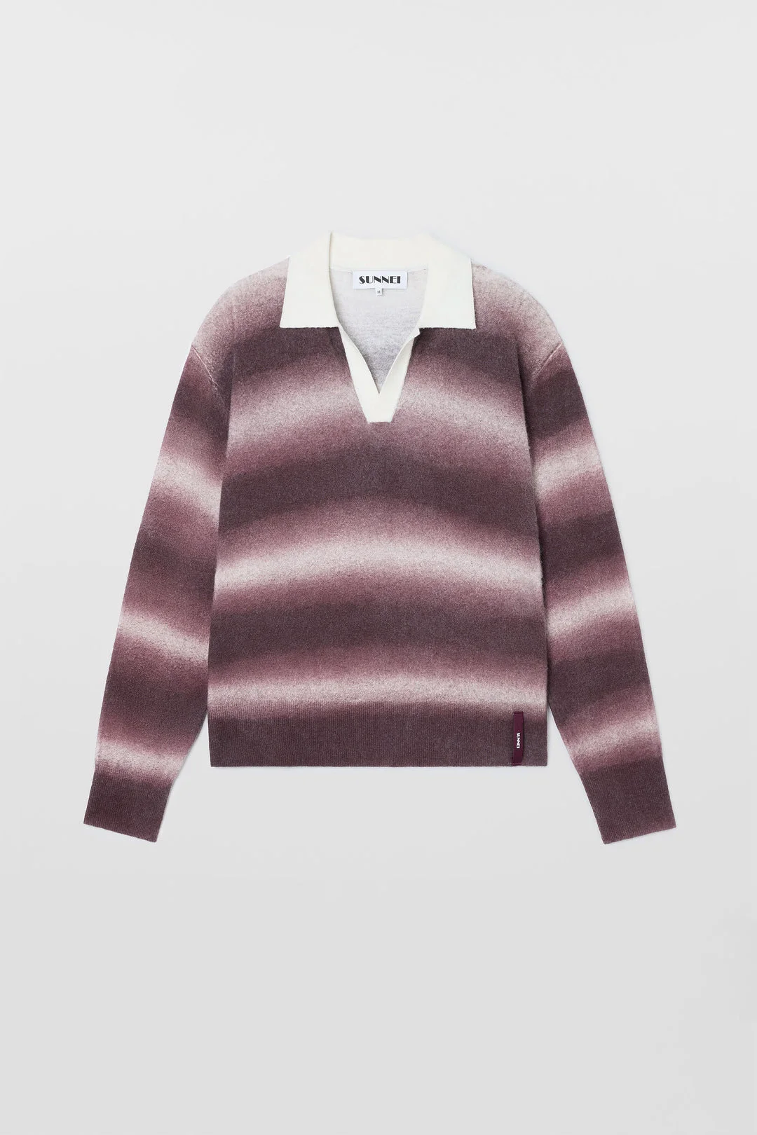 Longsleeve polo featuring burnt aubergine & off white cashmere and merino wool blend with contrast sprayed stripes, brushed knit and ribbed cuffs, and SUNNEI branded gros gain on bottom left loop. 5% CASHMERE 10% EXTRAFINE MERINO WOOL 23%VI 59%PA 3%EA Made in China