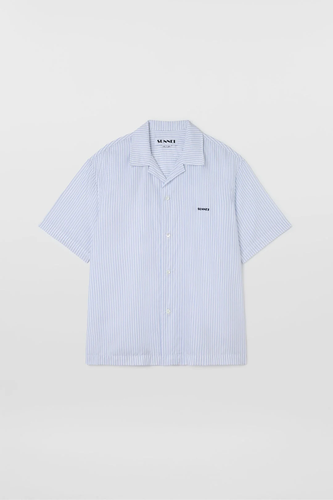 Over-fit shortsleeve shirt in azure & off white striped tencel fabric featuring mother pearl buttons closure and SUNNEI logo gros grain loop at the back. 100% TN Made in Italy Momo is wearing a size M. Model measures: Height: 187cm Chest: 75cm Waist: 63cm Hips: 85cm Shoe: 43