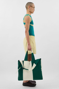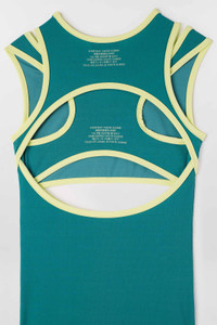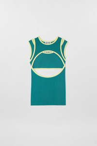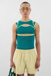 Stretchy jade green jersey combined top with cut-out top and bra featuring contrast piping and "EVERYDAY I WEAR SUNNEI" print logo on back. 75% PA 25%EA Made in Portugal Changmho is wearing a size M. Model measures: Height: 187cm Chest: 84cm Waist: 65cm Hips: 87cm Shoe: 44