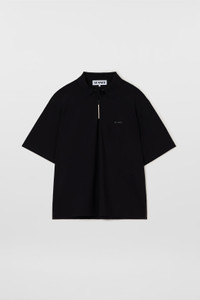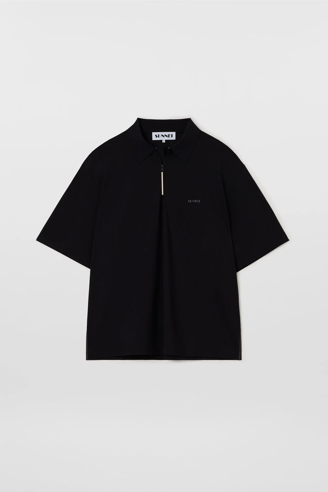 Technical black shortsleeve polo featuring laser cut and glued, waterproof zip on front with SUNNEI puller and SUNNEI box print on chest. 60%NY 40%EL Made in Portugal Etienne is wearing a size M. Model measures: Height: 188cm Chest: 92cm Waist: 75cm Hips: 86cm Shoe: 44