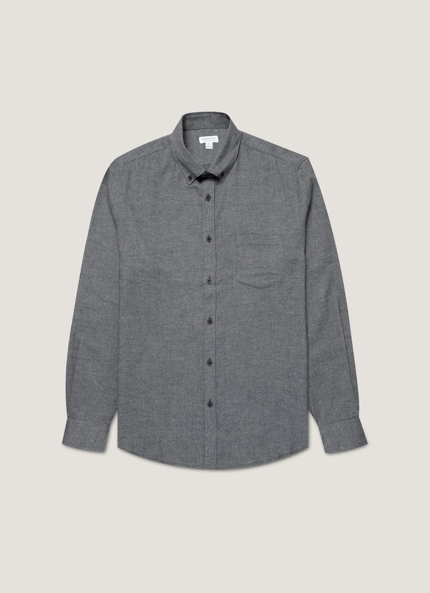 A luxurious shirt crafted from Italian-woven brushed cotton flannel with a subtle two-colour pique weave. Cut in a regular fit, it features a button-down collar and patch pocket. Perfect as a standalone shirt or layered over a T-shirt. Product Code: MSHT2135-GYAD Fabric & Care - 100% Cotton - Gentle wash at 40°C with similar colours - Do not tumble dry - Dry cleanable - Made in Portugal Size & Fit - Regular fit - Model is 6'2", chest 35" and wears a size M