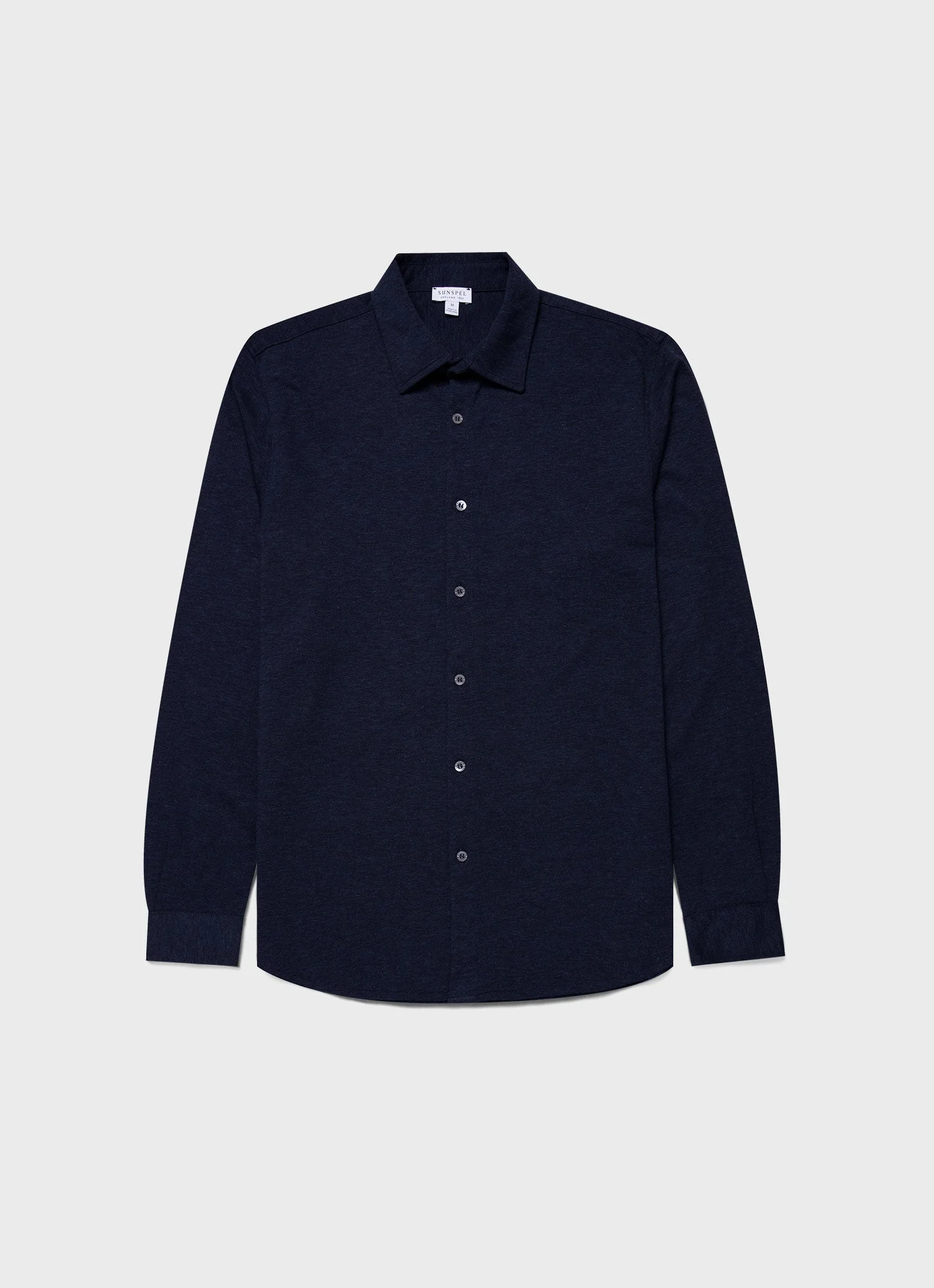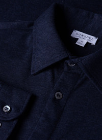 Drawing on our heritage of making the finest jersey fabrics, this refined and versatile shirt is crafted from a unique cotton-cashmere pique jersey from an Italian mill. The cotton gives the fabric a smooth feel, the cashmere adds softness and depth, and the pique weave introduces a subtle texture and a slight melange effect. With a regular fit, this is a luxurious wardrobe addition. Product Code: MSHT2097-BUAG Fabric & Care - 92% Cotton, 8% Cashmere - Shell buttons - Do not wash - Do not tumble dry - Dry clean only - Made in Portugal Size & Fit - Regular fit - Model is 6'1", chest 37.5" and wears a size M