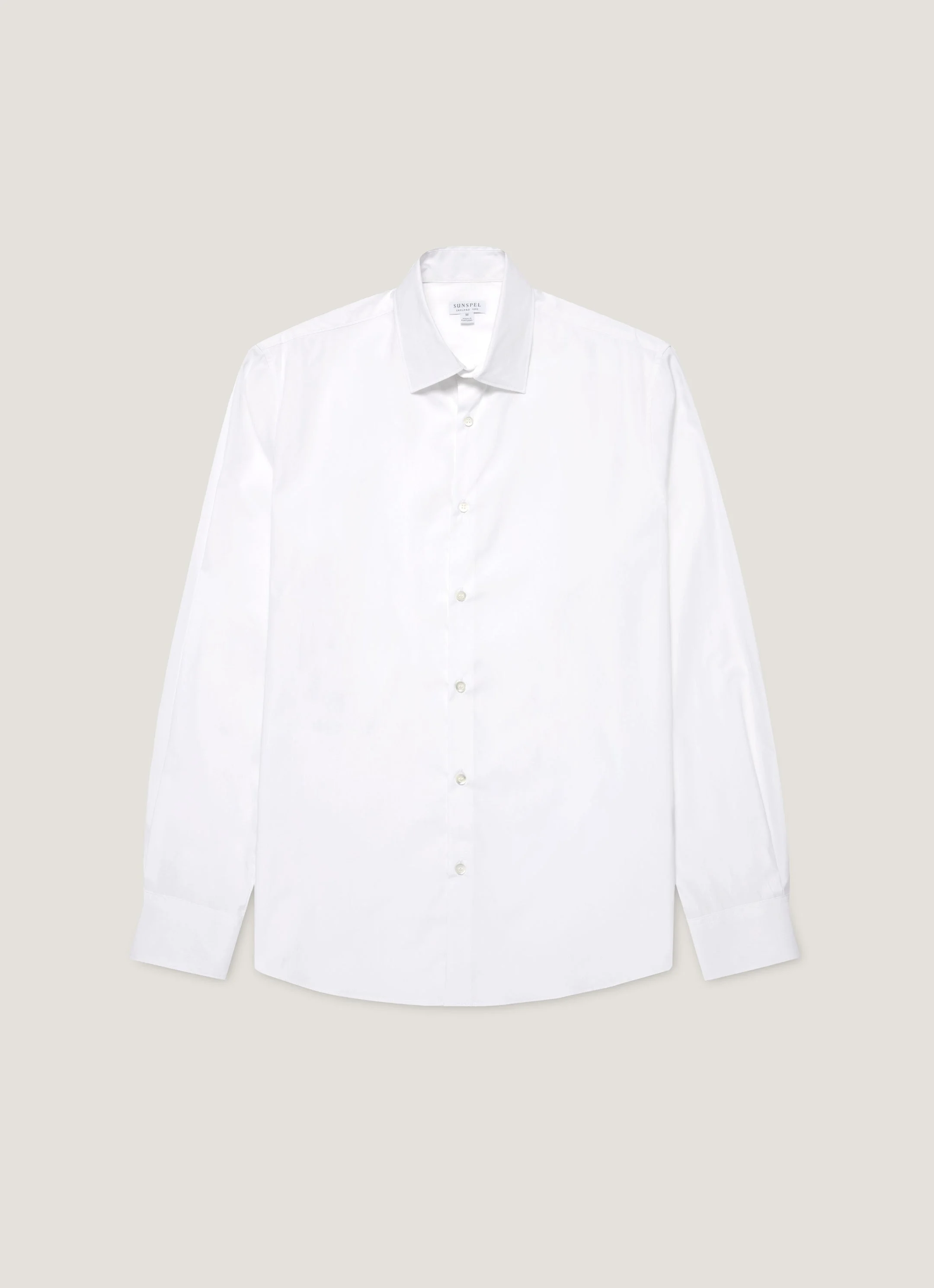 Perfect for work or formal occasions, this cotton poplin shirt has a slight stretch for added comfort and ease of movement. The fabric is crafted by a luxury Italian mill and it has a smart collar and regular fit. Product Code: MSHT2123-WHAA Fabric & Care - 97% Cotton, 3% Elastane - Gentle wash at 30°C with similar colours - Do not tumble dry - Dry cleanable - Made in Portugal Size & Fit - Regular fit - Model is 6'2", chest 38" and wears a size M