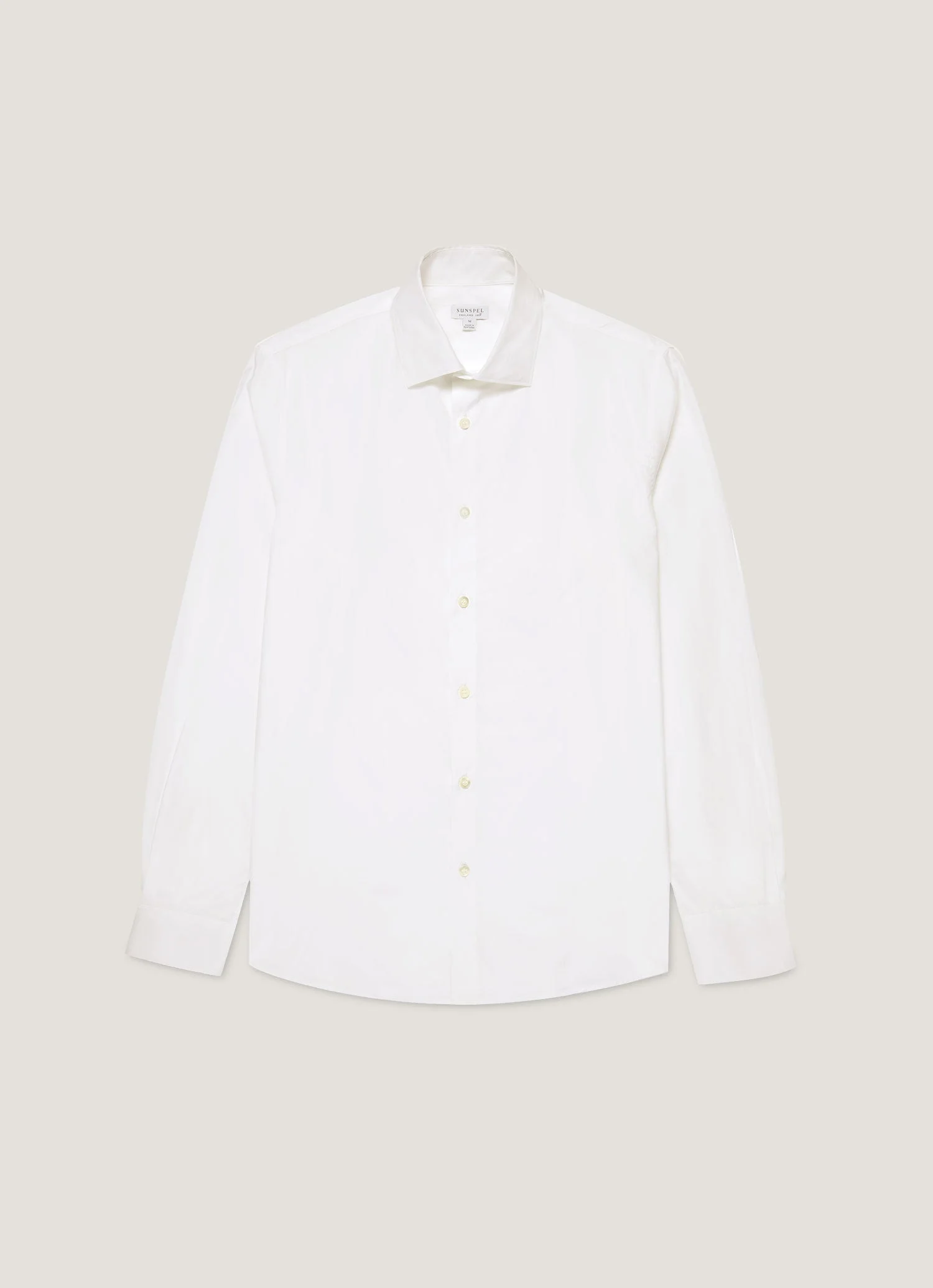 A refined formal shirt, crafted from exceptionally soft cotton poplin spun by a renowned Italian mill. It fits true to size and features a subtle cutaway collar, making it ideal for wearing with a tie. A timeless wardrobe essential. Product Code: MSHT2126-WHAA Fabric & Care - 100% Cotton - Shell buttons - Gentle wash at 40°C with similar colours - Do not tumble dry - Dry cleanable - Made in Portugal Size & Fit - Regular fit - Model is 6'3", chest 36" and wears a size M
