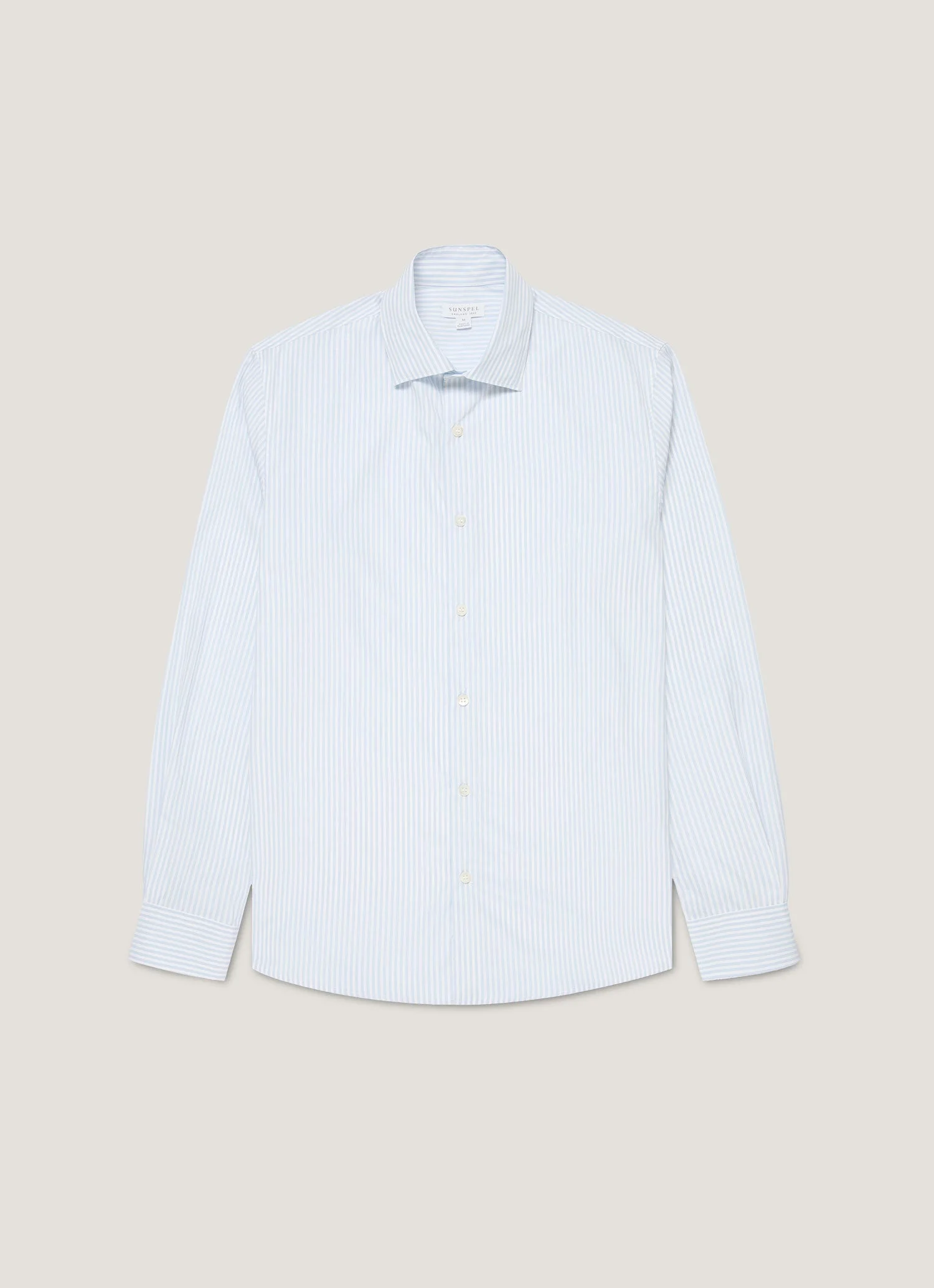 A refined formal shirt, crafted from exceptionally soft cotton poplin spun by a renowned Italian mill. It fits true to size and features a subtle cutaway collar, making it ideal for wearing with a tie. A timeless wardrobe essential. Product Code: MSHT2126-STNW Fabric & Care - 100% Cotton - Shell buttons - Gentle wash at 40°C with similar colours - Do not tumble dry - Dry cleanable - Made in Portugal Size & Fit - Regular fit - Model is 6'1", chest 36" and wears a size M