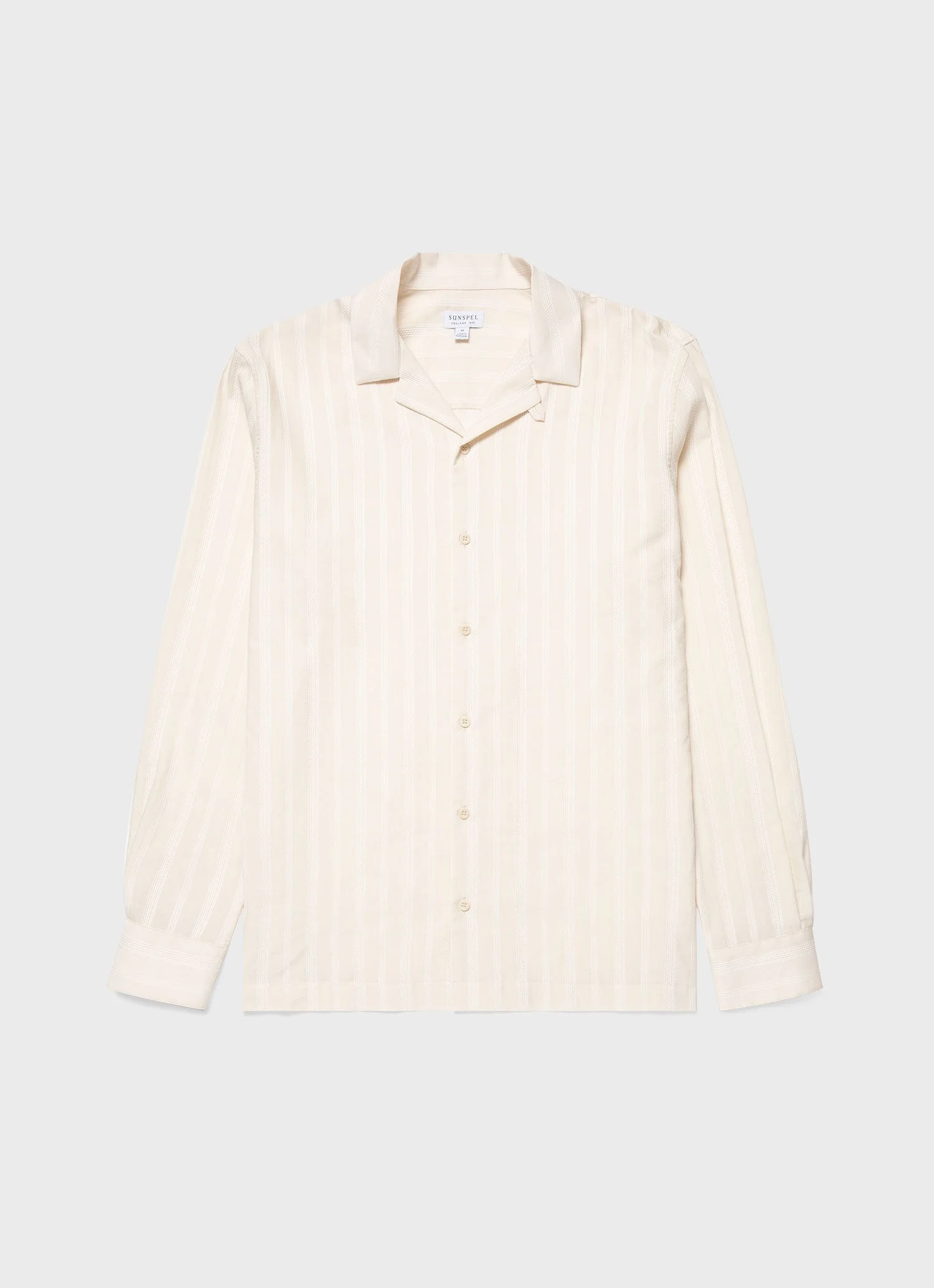 Lightweight, soft and comfortable, this embroidered stripe shirt is crafted by a luxury Italian mill. It has an easy fit and a camp collar. Perfect for high summer worn on its own or layered over our Q14 cellular vest. Product code: MSHT2080-WHCR Fabric & Care - 100% Cotton - Gentle wash at 30°C with similar colours - Do not tumble dry - Dry cleanable - Made in Portugal Size & Fit - Click here to view size chart - Fits true to size - take your normal size - Relaxed fit - Model is 6'2", chest 39" and wears a size M