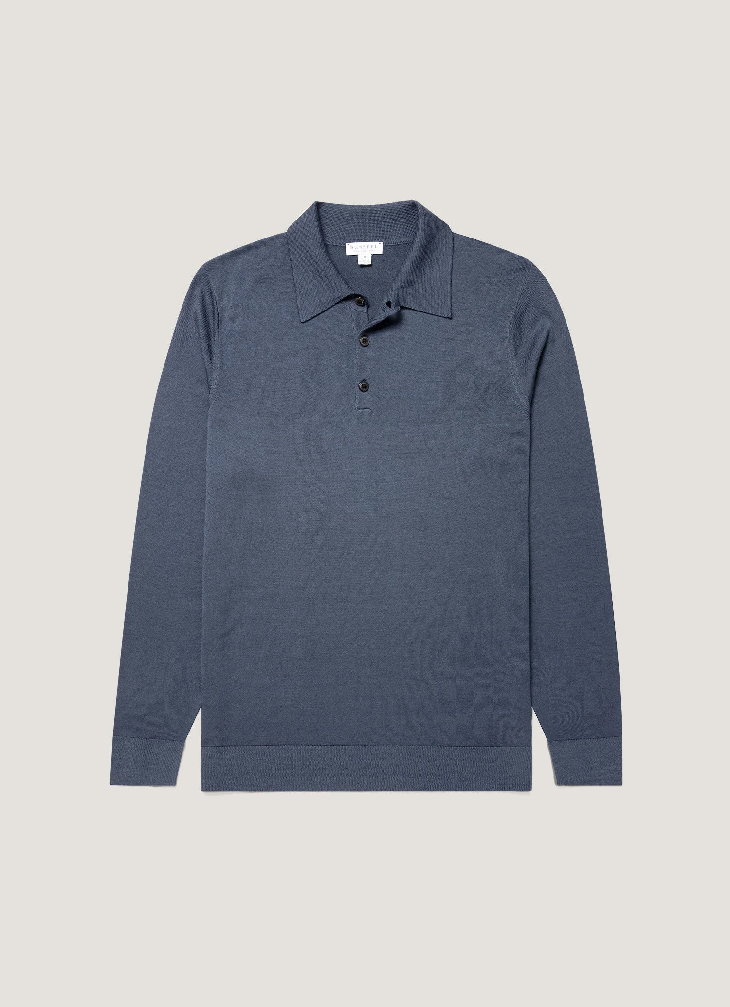 Drawing inspiration from the classic polo shirt, this versatile piece is crafted from Italian-spun extra-fine merino wool and is knitted on traditional Bentley frame knitting machines from Loughborough, England. Featuring a crisp collar, natural horn buttons and ribbed hems and cuffs, it is a lightweight, comfortable layering option for all year round. Product Code: MPOL8092-BUUA Fabric & Care - 100% Extra-Fine Merino Wool - Non-mulesed - Total Easy Care (TEC) treatment applied for machine washability and shrink resistance - Gentle wash at 30°C - Do not tumble dry - Dry cleanable - Made in Portugal Size & Fit - Regular fit - Model is 6'1", chest 38" and wears a size M
