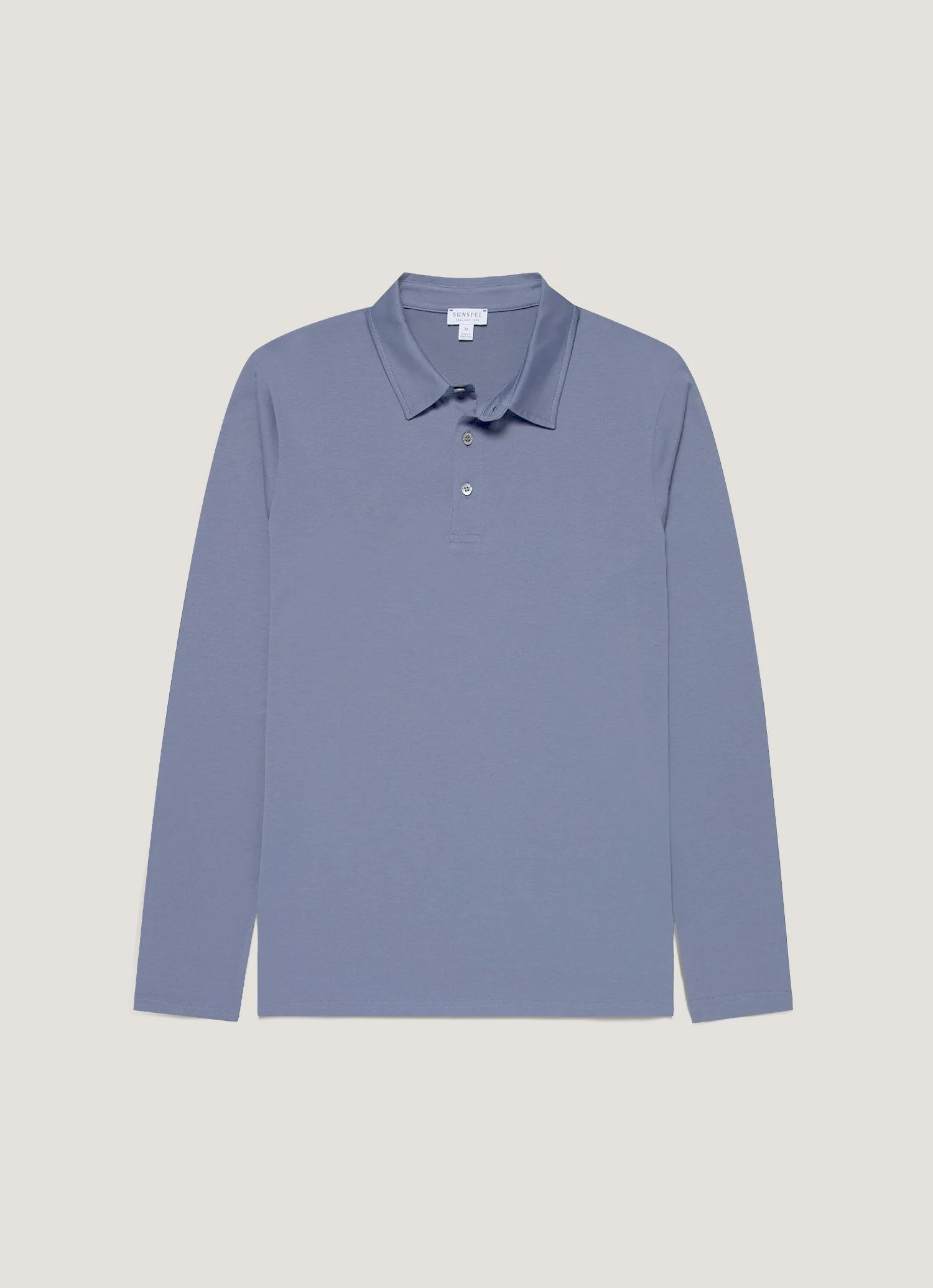 A long sleeve polo shirt made from the same Q82 jersey as our Classic T-shirt, crafted from the finest extra-long staple Supima cotton, traceable to a single Californian farm. Designed with a regular fit and a structured collar, it has a clean, refined look. An ideal transeasonal piece with an exceptionally smooth feel against the skin. Product Code: MPOL1054-BUWF Fabric & Care - 100% Supima Cotton - Cotton is fully traceable and sustainably sourced from a single farm in California - Cotton is extra-long staple and two-fold for durability and comfort - Shell buttons - Gentle wash at 30°C with similar colours - Do not tumble dry - Do not dry clean - Made in Portugal Size & Fit - Regular fit - Model is 6'1", chest 36" and wears a size M