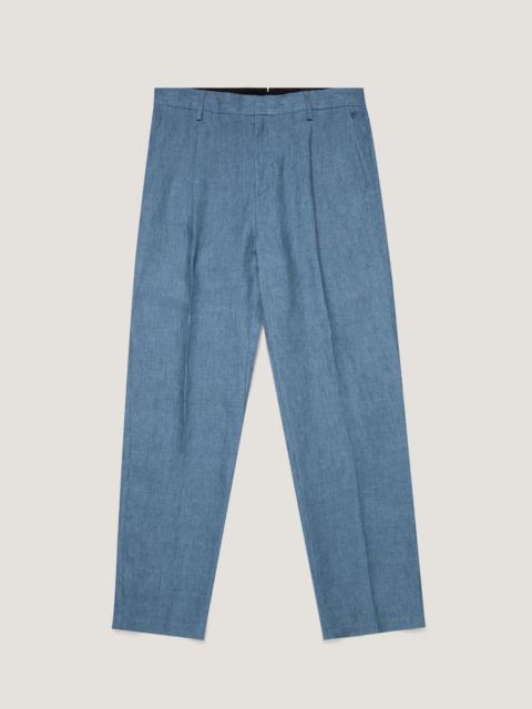 A smart linen trouser with a regular fit and single pleat front, crafted in a luxuriously lightweight linen sourced from a renowned Italian mill. Featuring a tailored waistband with notch detailing for added comfort, slanted side pockets with a single rear welt pocket. Pair with our matching linen blazer for a versatile modern suit. Product Code: MTRS3115-BUAF Fabric & Care - 100% Linen - Fabric woven in Italy for Leomaster - Do not wash - Do not tumble dry - Dry clean only - Made in Portugal Size & Fit - Regular fit - Pleat front - Tapered leg - Tailored waist - Model is 6'1" and wears a size 32