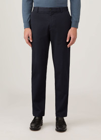 A regular-fit chino with a mid-to-low rise and a classic flat-front design. Crafted from lightweight Italian cotton with a touch of stretch for added comfort, and garment dyed for a soft, casual feel. Finished with a tailored waistband, button closure, zip fly, and single welt back pockets. Product Code: MTRS3113-BUAA Fabric & Care - 98% Cotton, 2% Elastane - Gentle wash at 40°C - Wash separately - Do not tumble dry - Dry cleanable - Made in Portugal Size & Fit - Regular fit - Flat front - Straight leg - Tailored waist - Model is 6'3" and wears a size 32