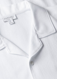 A camp collar version of the Riviera Polo Shirt which was made iconic by Daniel Craig in Casino Royale. The cool cotton mesh was designed for the heat of the French Riviera and is lightweight, breathable and very soft. Regular fit with matching buttons and a refined collar. The ultimate short-sleeve summer shirt. Product Code: MSHT2147-WHAA Fabric & Care - 100% Supima Cotton - Cotton is fully traceable and sustainably sourced from California - Cotton is extra-long staple for durability and comfort - Gentle wash at 30°C with similar colours - Do not tumble dry - Dry cleanable - Made in Portugal Size & Fit - Regular fit - Model is 6'3", chest 38" and wears a size M