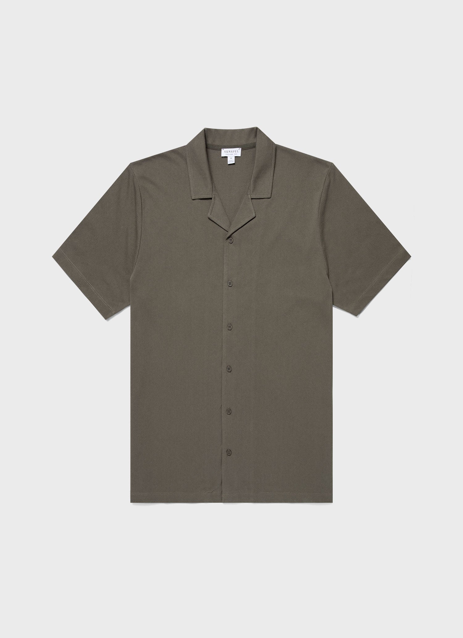 A camp collar version of the Riviera Polo Shirt which was made iconic by Daniel Craig in Casino Royale. The cool cotton mesh was designed for the heat of the French Riviera and is lightweight, breathable and very soft. Slim fit with matching buttons. The ultimate short sleeve summer shirt. Product Code: MSHT2046-GNGY Fabric & Care - 100% Supima Cotton - Cotton is fully traceable and sustainably sourced from a single farm in California - Cotton is extra-long staple for durability and comfort - Gentle wash at 30°C - Do not tumble dry - Dry cleanable - Made in Portugal Size & Fit - Click here to view size chart - Fits true to size - take your normal size - Relaxed Fit - Model is 6'1" and wears a size Medium