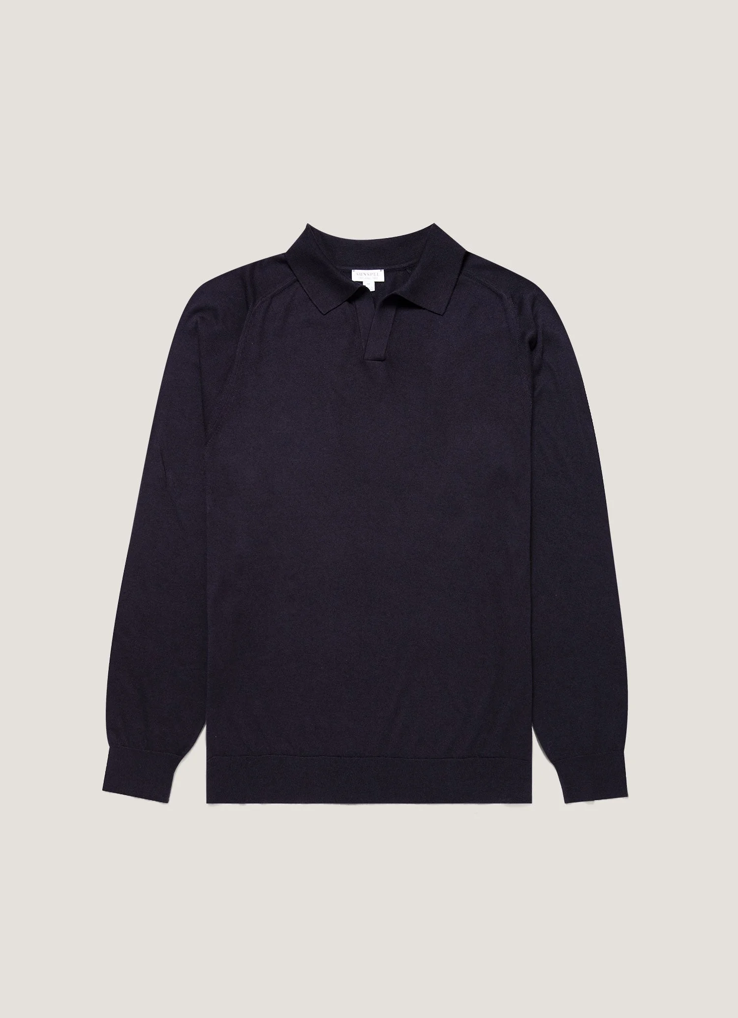 Combining the world's finest wool, cashmere, with the world's finest cotton, Sea Island cotton, this is the ultimate knitted polo. The cashmere-cotton mix makes it lightweight, soft and exceptionally smooth against the skin. Has soft rib trims, saddle raglan sleeves and an open placket collar. It is a perfect transeasonal layer under a blazer or as a standalone piece. Product Code: MPOL8204-BUVN Fabric & Care - 85% Sea Island Cotton, 15% Cashmere - Do not wash - Do not tumble dry - Dry clean only - Made in Portugal Size & Fit - Regular fit - Model is 6'2", chest 38" and wears a size M