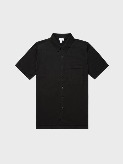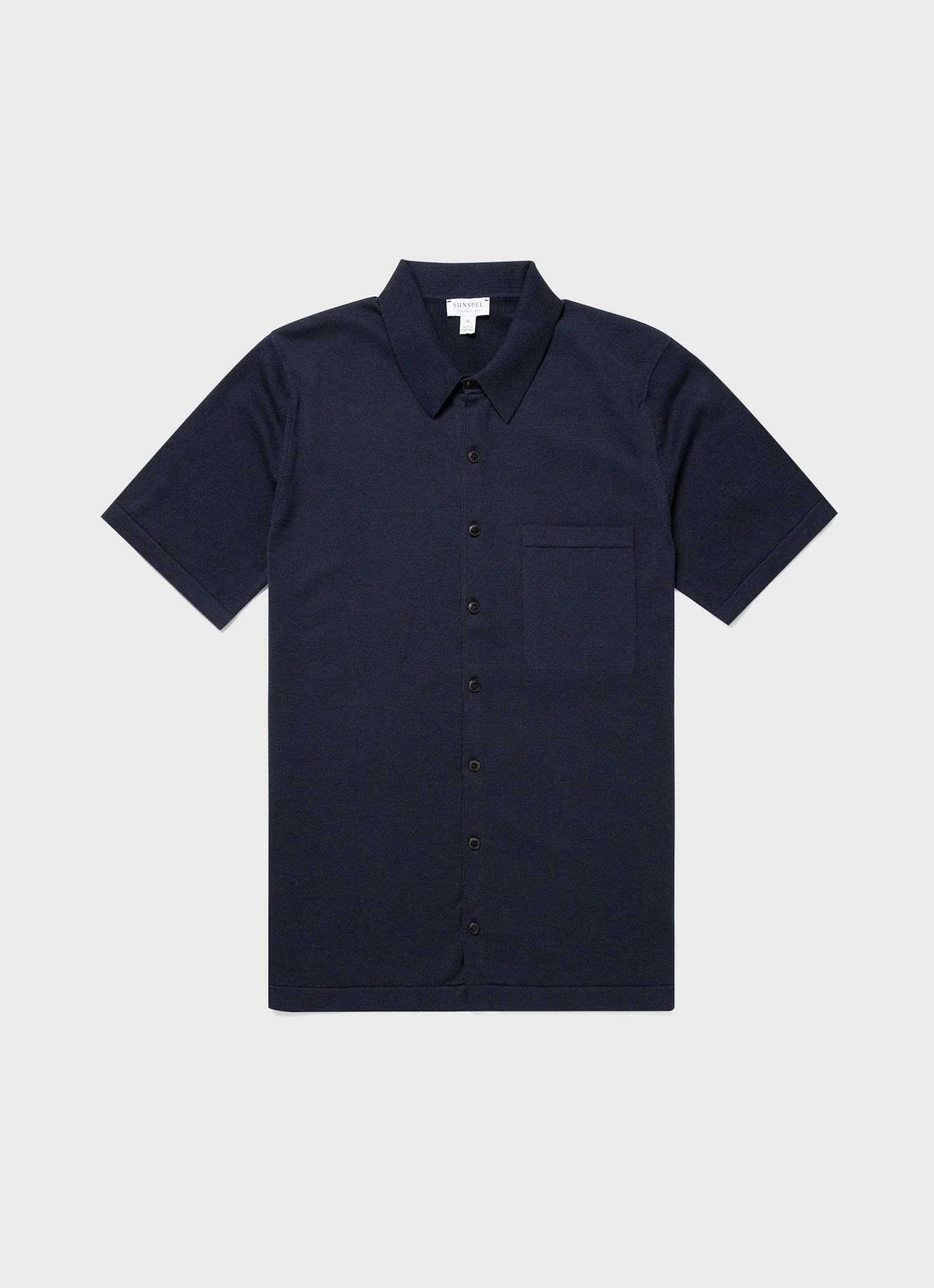 A new style in our Sea Island range, this short sleeve summer shirt is knitted using the finest cotton in the world. Grown in the West Indies and still harvested by hand, Sea Island is the world's rarest cotton and has the longest staple, giving it both strength and extraordinary softness. The fit is regular with a pocket. Pair with travel wool trousers for a contemporary classic look. Product code: MSHT8110-BUAF Fabric & Care - 100% Sea Island Cotton - Gentle wash at 30°C - Wash dark colours separately - Do not bleach - Do not tumble dry - Dry cleanable - Warm iron inside out - Designed in England and made in Portugal