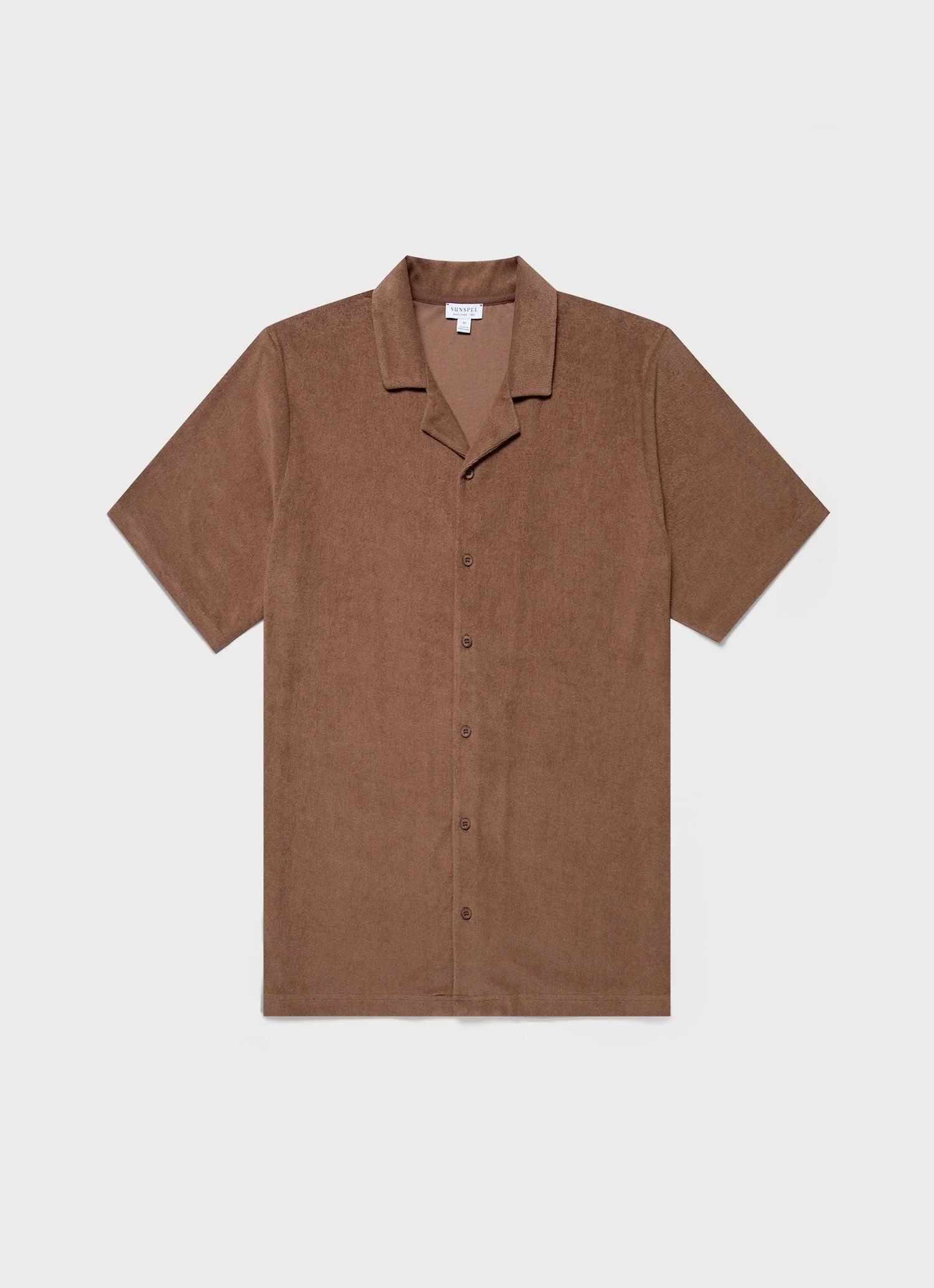 An elevated short sleeve summer shirt in a super-soft organic cotton towelling that's lightweight and breathable. With a clean camp collar, it's a contemporary, versatile summer layer. Pair with our cotton linen shorts. Product code: MSHT1571-BREY Fabric & Care - 100% Cotton - Gentle wash at 30°C with similar colours - Do not tumble dry - Do not dry clean - Made in Portugal Size & Fit - Click here to view size chart - Fits true to size - take your normal size - Relaxed fit - Model is 6'1" and wears a size Medium