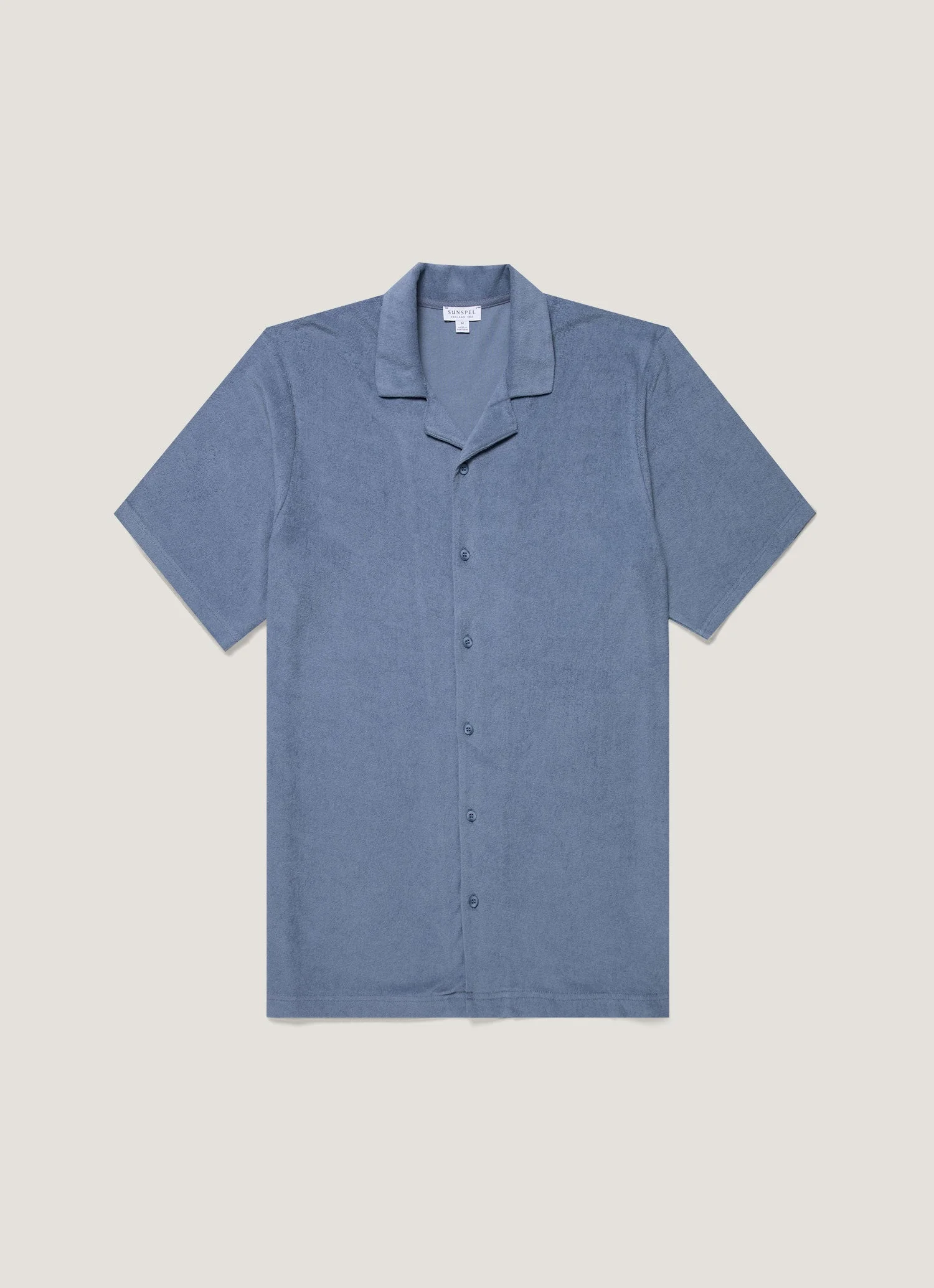 An elevated short sleeve summer shirt in a super-soft organic cotton towelling that's lightweight and breathable. With a clean camp collar, it's a contemporary, versatile summer layer. Pair with our cotton linen shorts. Product Code: MSHT1571-BUWB Fabric & Care - 100% Cotton - Gentle wash at 30°C with similar colours - Do not tumble dry - Do not dry clean - Made in Portugal Size & Fit - Regular fit - Model is 6'1", chest 38" and wears a size M