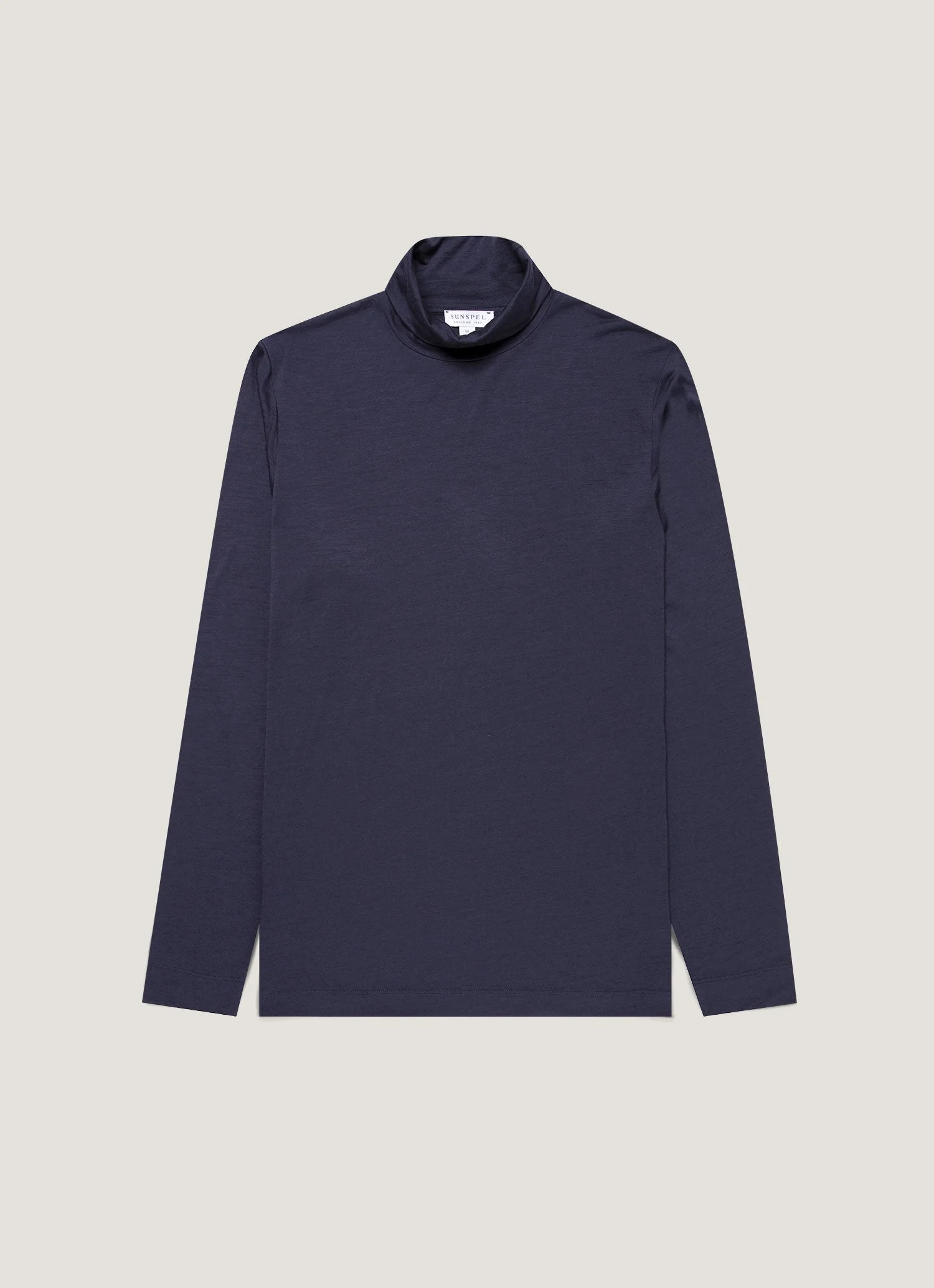 An elegant roll neck jumper crafted from ultra-fine merino wool jersey. Lightweight and refined, it is perfect for wearing under tailoring as a smart alternative to knitwear. Soft and breathable, it’s comfortable enough to wear directly against the skin. An ideal everyday winter piece, it has a regular fit and minimal detailing. Product Code: MTSH0198-BUAA Fabric & Care - 100% Merino Wool - Gentle wash at 30°C on delicate cycle - Do not tumble dry - Do not dry clean - Made in Portugal Size & Fit - Regular fit - Model is 6'1", chest 36" and wears a size M