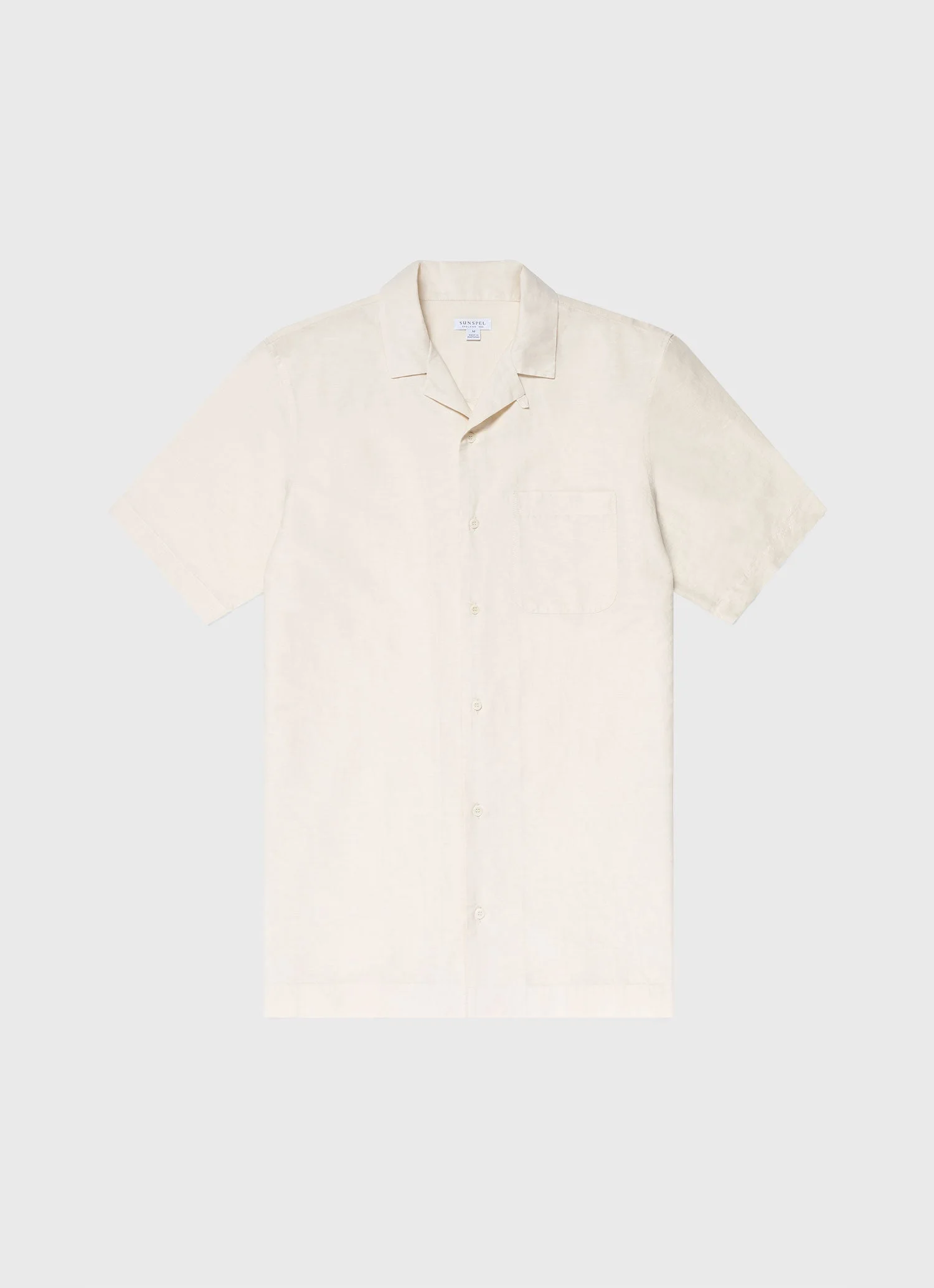 This elegant shirt blends the smoothness of cotton with the textured lightness of linen. Woven by Italian mill MTVV who are famous for their exceptionally soft and durable fabrics. It has a roomy fit for a relaxed style with a chest pocket, camp collar and tab button to dress up. Wear it open with a Classic T-shirt or on its own. Product Code: MSHT2066-WHCR Fabric & Care - 59% Cotton, 41% Linen - Fabric by MTVV, Italy - Gentle wash at 40°C with similar colours - Do not tumble dry - Dry cleanable - Made in Portugal Size & Fit - Fits true to size - take your normal size - Relaxed Fit - Model is 6'1" and wears a size Medium