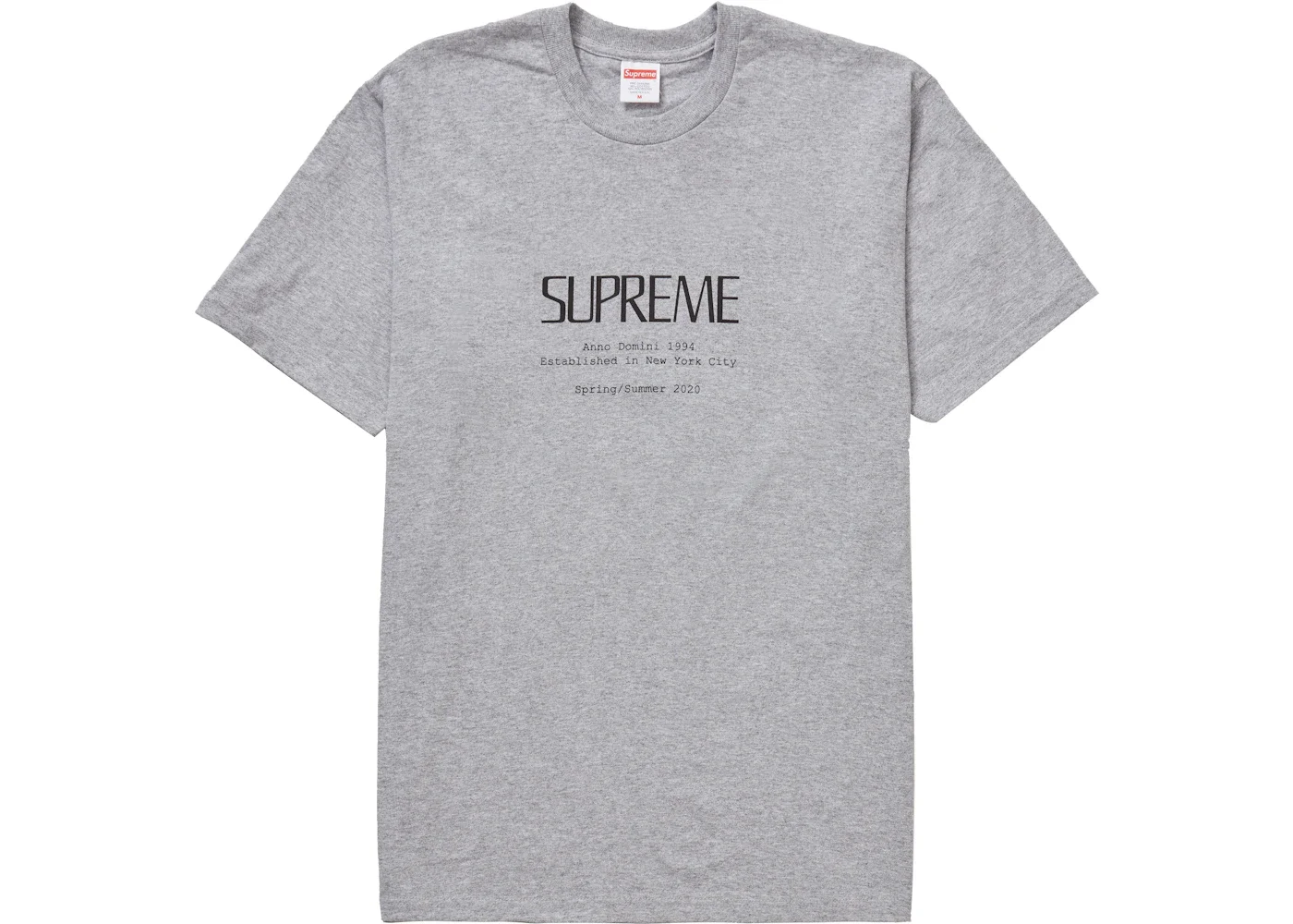 The Supreme Anno Domini Tee Heather Grey is a minimalistic design tee shirt with short sleeves presenting in a heather grey colorway from the skateboarding brand Supreme. This shirt was released as part of Supreme’s spring/summer 2020 capsule and is one of eight colorways. This iteration is a heather grey colorway which is a neutral color that pairs well with all colors and can be worn underneath hoodies or sweatshirts to provide an extra layer. The front features the brand’s name printed in block letters with the phrase Anno Domini 1994 Established in New York City, which is a nod to the founding year and location of the Supreme brand. Spring/Summer 2020 sits below that and there is a Supreme tag at the nape of the collar. We love that Supreme produces everyday styles that promote the brand in a fun way, as this tee shirt does. Supreme Anno Domini Tee Heather Grey debuted on July 20, 2020, with a $38 price tag. - Season SS20 - Color Heather Grey - Release Date 2020-07-02 - Retail Price 38 - Featured false