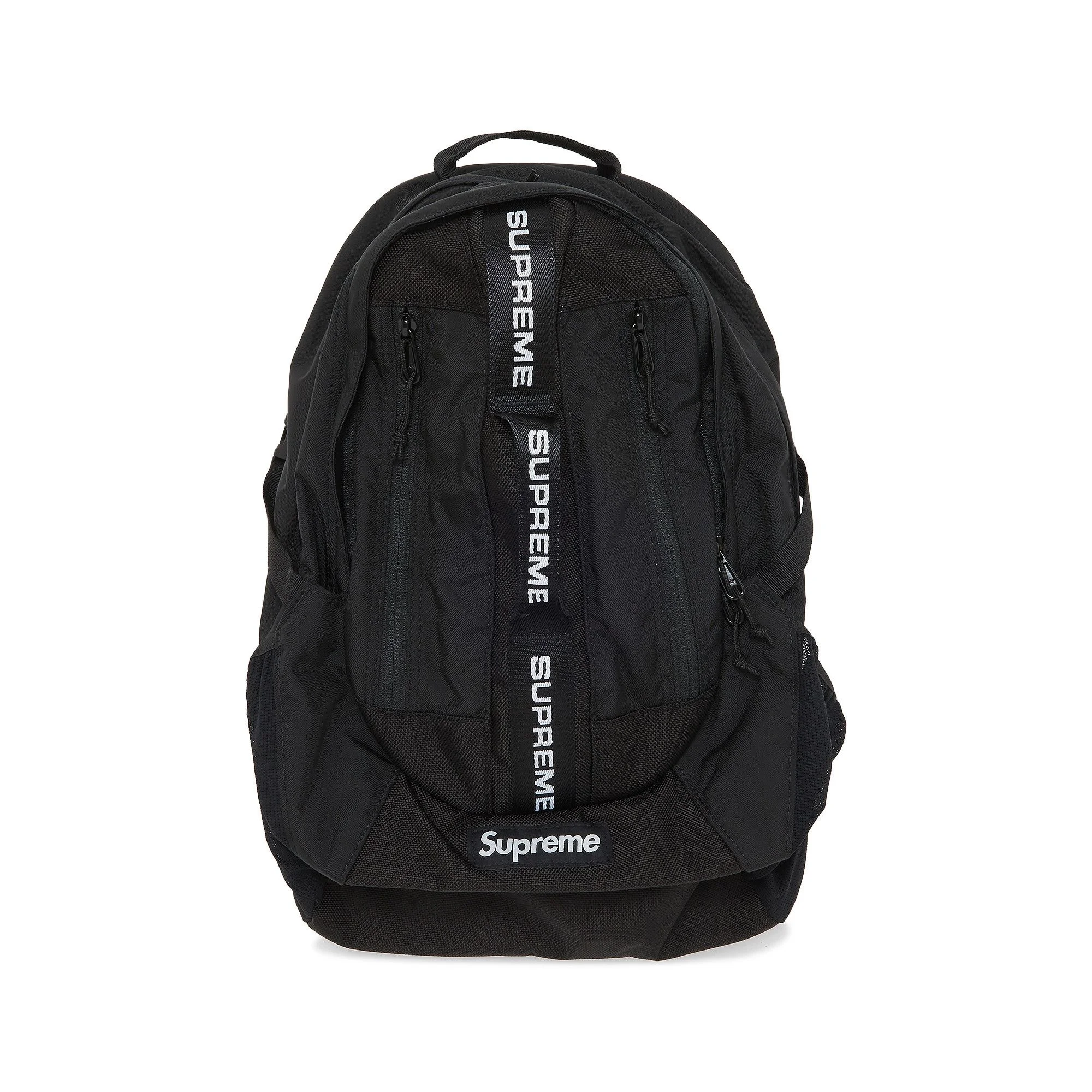 This Supreme backpack from FW22 features a logo-embroidered webbing strap down the front that complements a fixed logo detail. Rendered in black, it features a spacious central compartment as well as additional zipper pockets for easy organization.