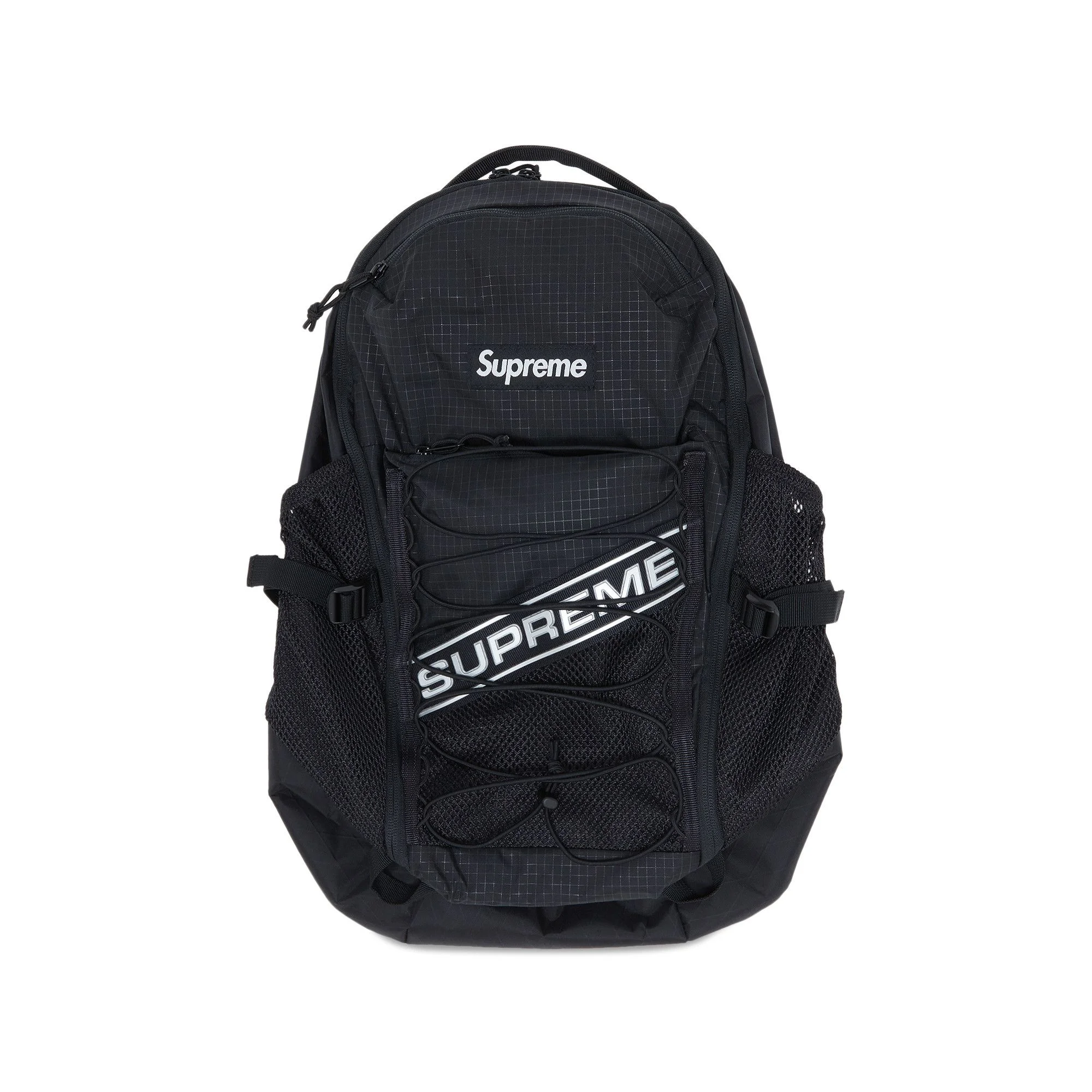 Supreme's Backpack from FW23 is sized to carry several books and a laptop. Rendered in black, the accessory is detailed with two logo embroideries and mesh side pockets.