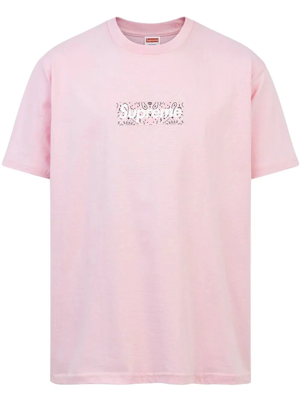 Bandana Box Logo crew neck T-shirt Supreme reimagines their signature box logo with a bandana print here. It details the front of this pink relaxed T-shirt for a branding-focused finish. Highlights - Pink - Cotton - Bandana print - Signature box logo - Round neck - Short sleeves - Straight hem Imported Composition Cotton 100%