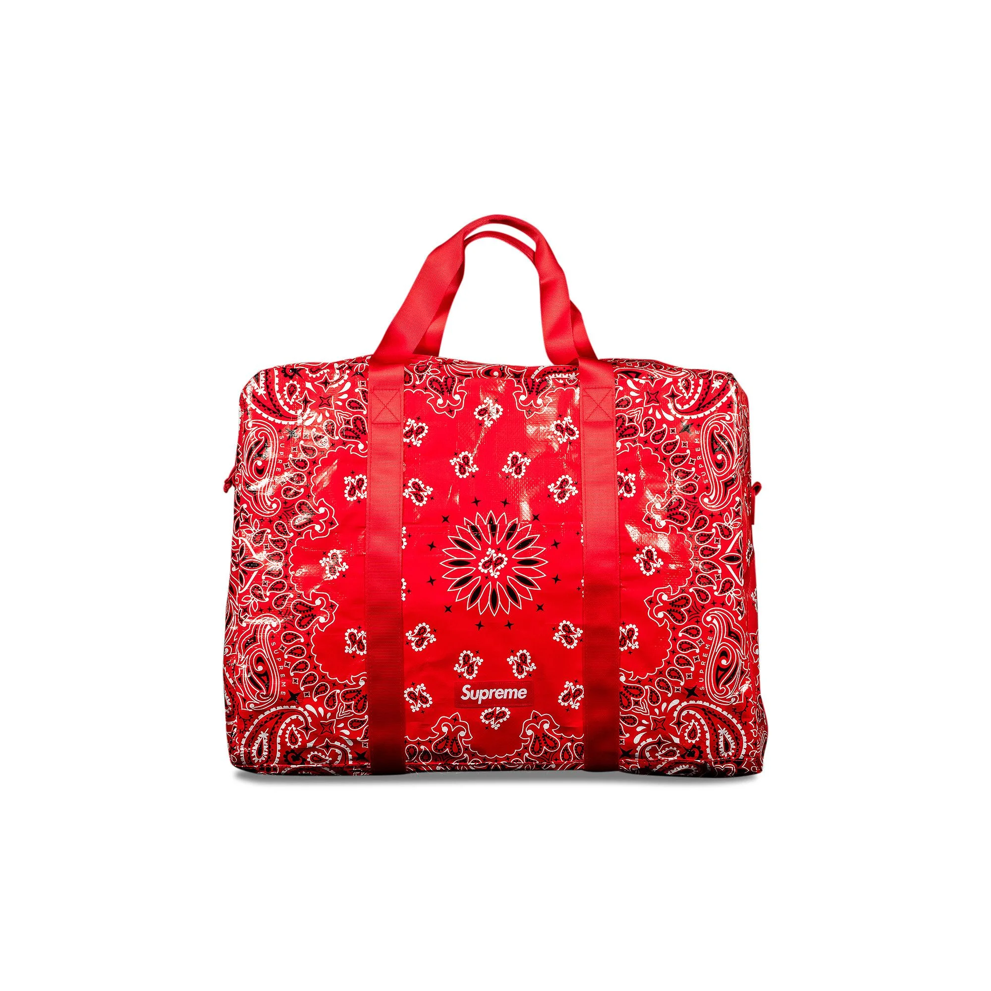 This large Supreme duffle bag is made from a water-resistant laminated tarp material with a red bandana print. From the SS21 season, the accessory features a roomy central compartment and a front pocket. The shoulder strap is adjustable.