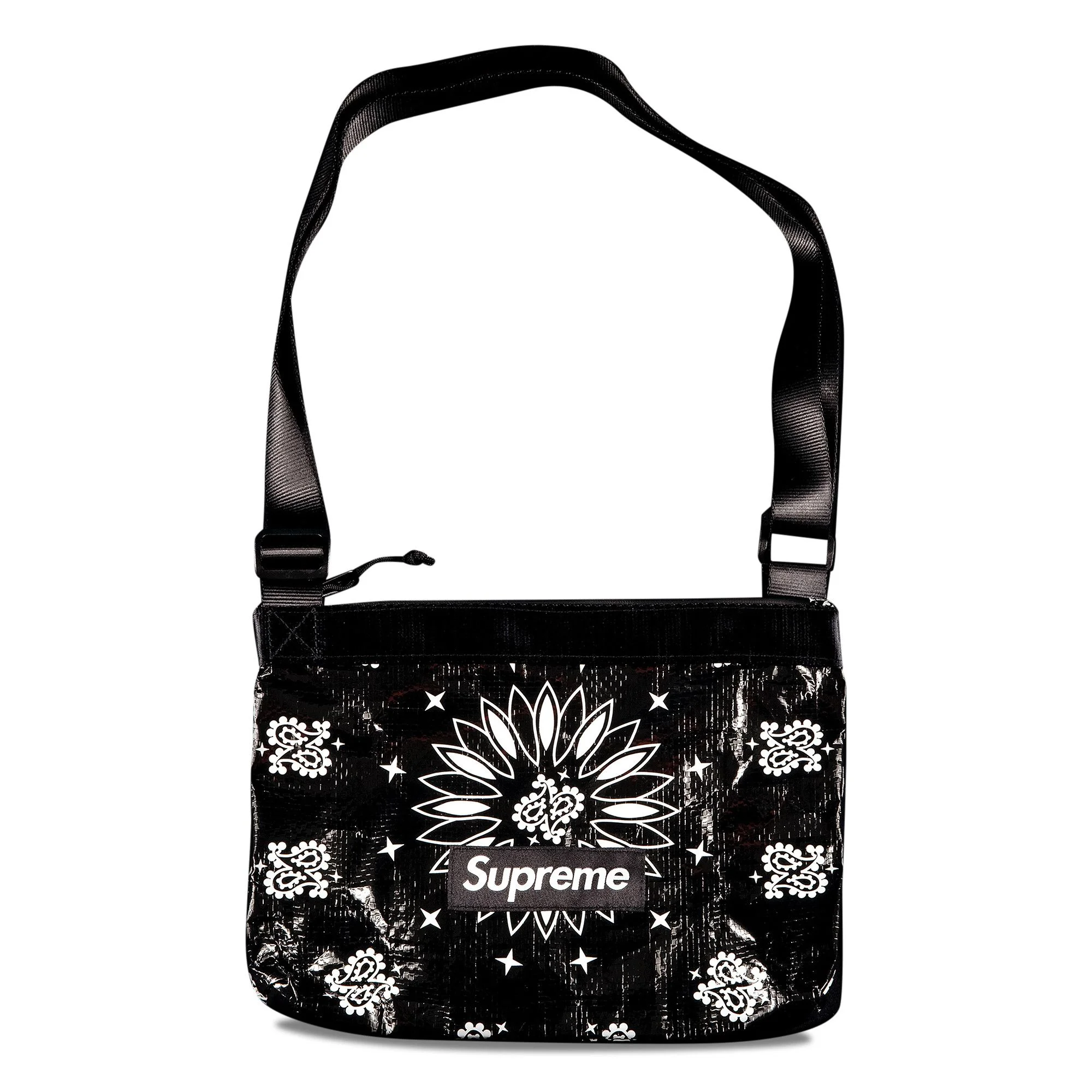 Supreme's Bandana Tarp Side Bag from SS21 is patterned in white paisley over a black background. Sized to carry daily essentials, it features an adjustable strap that can be worn over the shoulders or across the body.
