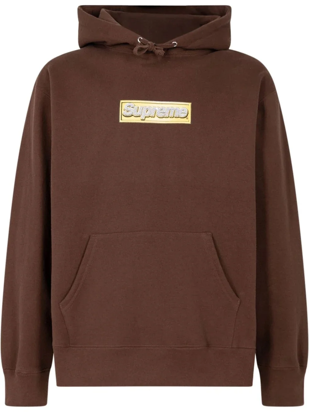 Bling Box Logo drawstring hoodie The Supreme Bling Box Logo hoodie in brown is an all-cotton hooded sweatshirt by the 'World Famous' streetwear brand that features its iconic Box Logo in a fun design. The piece is highlighted by a 'bling' style Box Logo on the chest remembering late ‘90s and early 2000s hip-hop culture. Made in United States Composition Cotton 100%