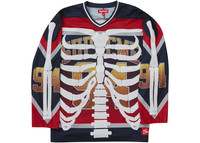 The Supreme Bones Hockey Jersey Multicolor preserves a vibrant athletic look while introducing a colorful pattern that categorizes it among the casual wear collection. A colorful V-neck meets a multicolor yoke just before dropping to a lustrous applique of the Supreme brand logo in this Bones Hockey Supreme garment. The number 94, also appearing in a golden tint, covers most of the body area. These tackle twills are obscured by a bold skeletal overlay depicting the bones of the human body. The skeletal structure proceeds to cover the graphics on the long sleeves sewn on well-blended shades of crimson red, light gray and black. The outstanding feature of the Supreme Bones Hockey Jersey Multicolor is the x-ray replica imprint that encases most of the front. The graphic fades off at the back, leaving a clear view of a stylish display of the signature Supreme logo and number 94. During its release on August 17th, 2023 this jersey had a retail price set at $148. - Season FW23 - Color Multicolor - Release Date 2023-08-17 - Retail Price 148 - Featured false - Uploaded By LL