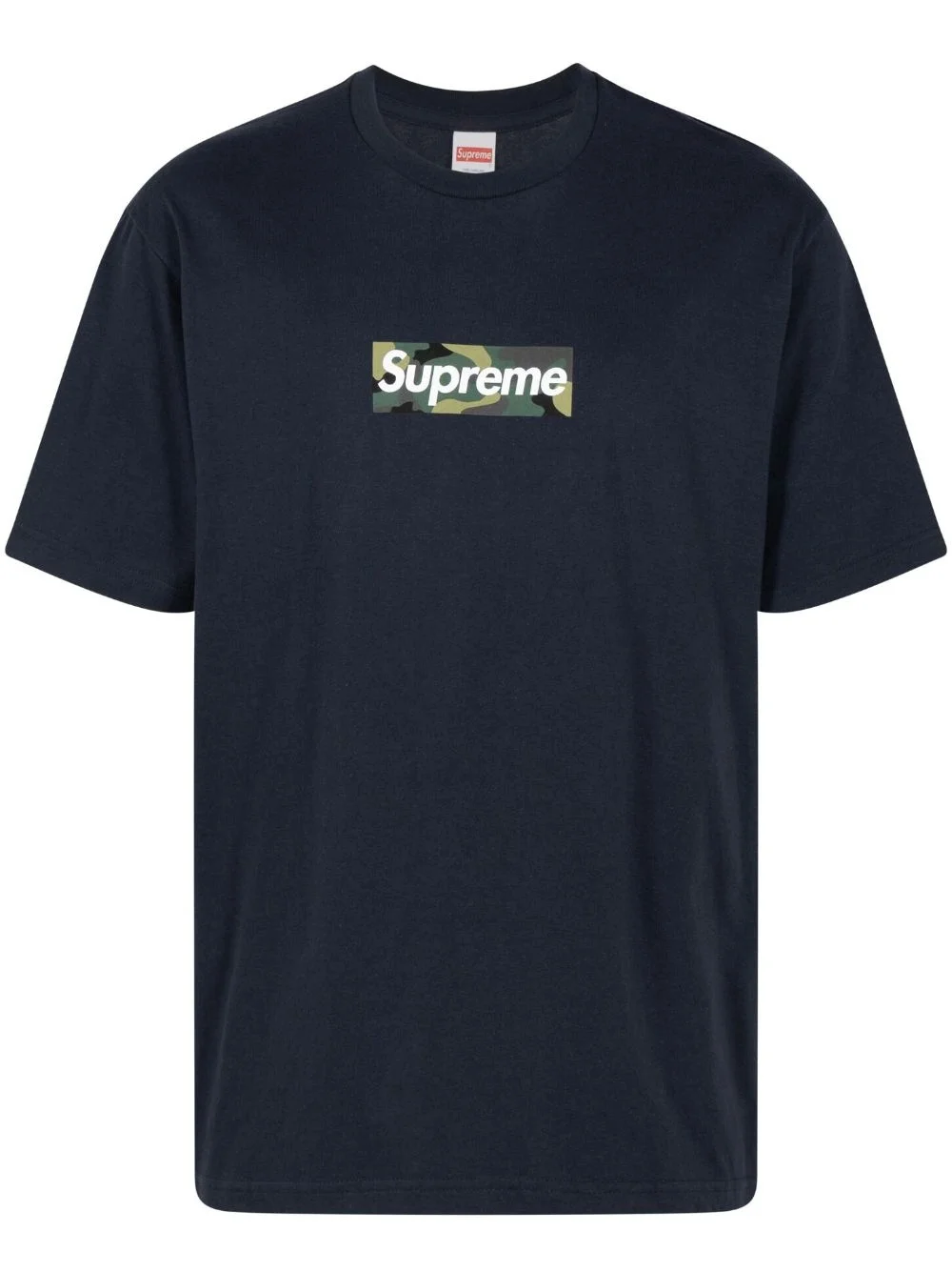 box logo cotton T-shirt Supreme's box logo is an iconic symbol in the world of streetwear. Designed in 1994 to coincide with the shop's opening in New York City, it features the brand's name in bold white lettering inside a rectangular red box. Throughout the years, it has been reinterpreted through different lenses, as seen in this navy-blue T-shirt: cut from cotton, it is adorned with a camouflage version of the minimalist emblem. Highlights - Navy blue - Cotton - Jersey texture - Camouflage print - Signature box logo - Crew neck - Drop shoulder - Short sleeves - Straight hem - When buying this unisex item, keep in mind that it is graded in standard men's sizing. Imported Composition Cotton 100% Washing instructions Read Manufacturer Guidelines