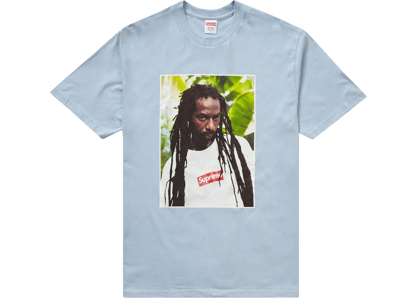 As a part of their 2019 Summer tees release, Supreme also added a new Photo Tee to their running catalog. 2019's photo tee addition features Jamaican Dancehall and Reggae Musician, Buju Banton, who is pictured wearing the iconic red box logo tee as is tradition in Supreme's past Photo Tees. The back of the tee features a note from Buju, "Supreme forward ever stand firm jah love". The Supreme Buju Banton Photo Tee dropped on Thursday, June 27th, 2019 and retailed for $48 USD. - Season SS19 - Color Light Blue - Release Date 2019-06-27 - Retail Price 48 - Featured false