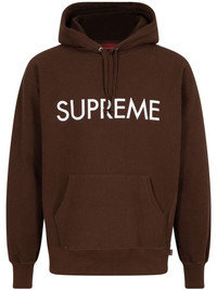 Capital long-sleeve hoodie Supreme is back with its iconic streetwear staples. The Capital long-sleeve hoodie features a relaxed cut, crafted from brown-hued cotton, and is enhanced with a contrasting embroidered logo on the chest. Imported Composition Cotton 100%