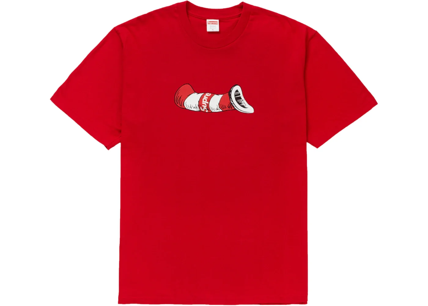The Supreme Cat in the Hat Tee Red showcases a playful and nostalgic design inspired by the beloved Dr. Seuss character. Crafted from premium cotton fabric, the Supreme Cat in the Hat Tee features a vibrant red hue that serves as the backdrop for the iconic Cat in the Hat graphic displayed prominently across the chest. The graphic doesn't depict the playful cat character, but instead showcases his iconic tall hat in red and white stripes, contributing a whimsical element to the shirt's design. The graphic’s whimsical presence is complemented by the Supreme box logo positioned subtly in the graphic of the hat, enhancing the shirt's appeal with the fusion of streetwear and nostalgic childhood elements. The tee includes short sleeves and a crew neckline, ensuring comfort and a classic fit suitable for casual wear. We think the highlight of the Supreme Cat in the Hat Tee Red is the prominent graphic displaying the iconic hat, encapsulating the essence of Dr. Seuss's cherished creation and injecting a nostalgic charm into the shirt's overall design. The tee debuted on the 13th of December 2018 for $44. - Season FW18 - Color Red - Release Date 2018-12-13 - Retail Price 44 - Featured false - Styles Headwear