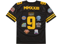 The Supreme Championships Embroidered Football Jersey Black is a football jersey from the Supreme Championships Embroidered Football Jersey released as part of the Fall/Winter 2023 ‘FW23’ collection. Available in black with yellow detailing, this Supreme Championships football jersey has a ribbed V-neck, short-sleeve design, and is crafted from poly eyelet mesh with dazzle yoke. It features different badges embroidered at the front, back, and shoulders, Supreme wording at the front, the number ‘9’ at the front, back, and shoulders, and the Roman numeral ‘MMXXIII’ on the nameplate. Two yellow stripes on the sleeves, an Athletic label at the lower front, and a woven neck tag with the trademark Supreme red box logo complete the design. What our experts love about this jersey is its design and material. The embroidered patch pattern adds a distinctive touch to the design, while the high-quality build offers comfort and longevity. The Supreme Championships Embroidered Football Jersey Black was released on August 31st, 2023, retailing at $148. - Season FW23 - Color Black - Release Date 2023-08-31 - Retail Price 148 - Featured false - Uploaded By LL
