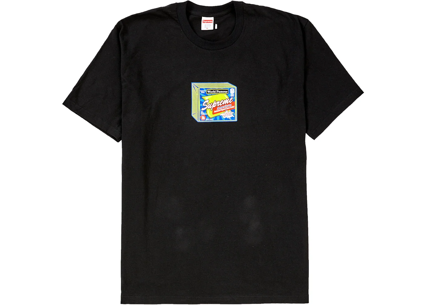 After releasing two major collaborations in a row for weeks 5 and 6, Supreme kept things in-house for their Week 7 release of the FW19 season which featured their second set of fall tees. Released as a part of the tee drop was the Supreme Cheese Tee in seven colors. The Cheese Tee likely takes its nod from the popular sliced cheese, Kraft Singles, with Supreme branding replacing the Kraft branding. The Supreme Cheese Tee released on October 10th, 2019, and retailed for $38 USD. - Season FW19 - Color Black - Release Date 2019-10-10 - Retail Price 38 - Featured false