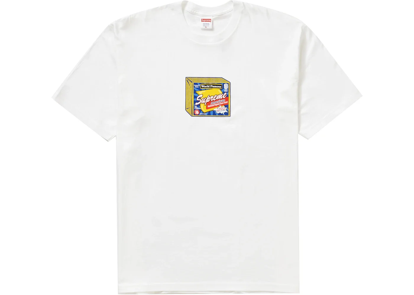 After releasing two major collaborations in a row for weeks 5 and 6, Supreme kept things in-house for their Week 7 release of the FW19 season which featured their second set of fall tees. Released as a part of the tee drop was the Supreme Cheese Tee in seven colors. The Cheese Tee likely takes its nod from the popular sliced cheese, Kraft Singles, with Supreme branding replacing the Kraft branding. The Supreme Cheese Tee released on October 10th, 2019, and retailed for $38 USD. - Season FW19 - Color White - Release Date 2019-10-10 - Retail Price 38 - Featured false