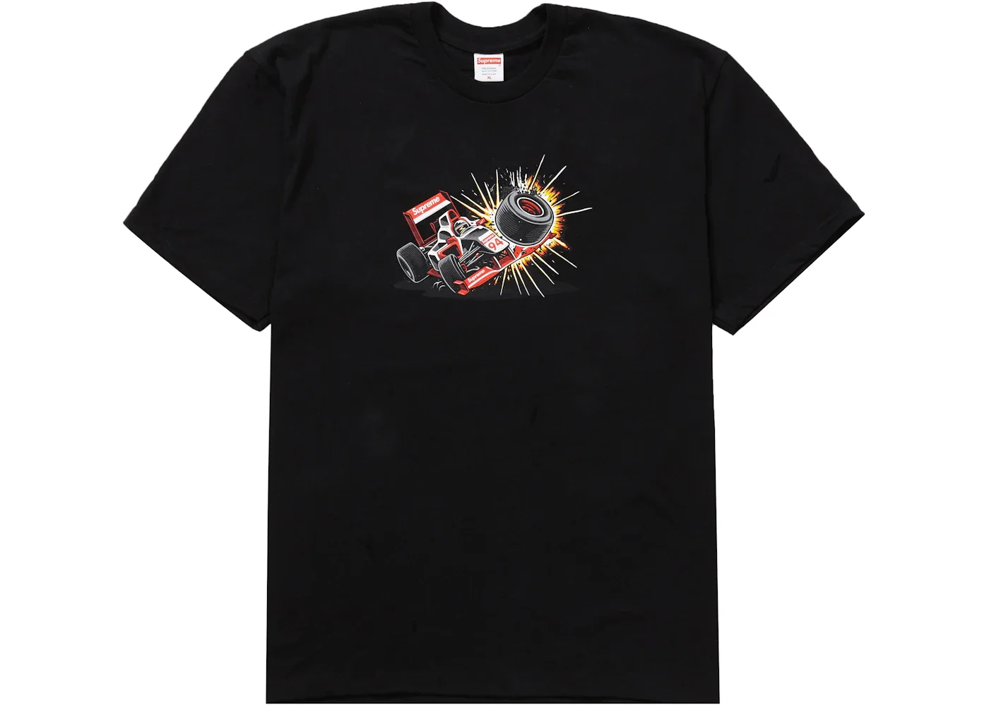 This black Supreme Graphic T-shirt was released in October of 2021 as a part of the brand's Fall Tees release. Supreme released eight new t-shirts, including this one, as a part of their Fall/Winter 2021 Fall Tees drop. This particular t-shirt features a crashing Supreme Formula 1 car illustrated by Sean Cliver on the front. Supreme released their Crash T-shirt in black on October 7th, 2021, at the retail price of $38. - Season FW21 - Color Black - Release Date 2021-10-07 - Retail Price 38 - Featured false