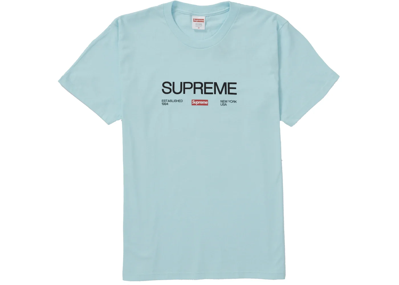 The Supreme Est. 1994 Tee Turquoise is a short-sleeved t-shirt whose design pays homage to the founding of the Supreme brand that occurred in New York City in 1994. This version of the Supreme Est. 1994 Tee comes in a turquoise color that dominates the shirt. The classic tee is made of 100% cotton for comfort and contains the Supreme name in thin black text across the chest, with "Established 1994" and "New York USA" appearing in smaller black text underneath it. A red Supreme box logo can also be found underneath the larger brand name. The back of the t-shirt is plain turquoise. What we like most about this t-shirt is the simple design, which allows the message of the establishing date to stand out. The Supreme Est. 1994 Tee Turquoise was originally released to the public on August 19, 2021, for a retail price of $38. - Season FW21 - Color Turquoise - Release Date 2021-08-19 - Retail Price 38 - Featured false