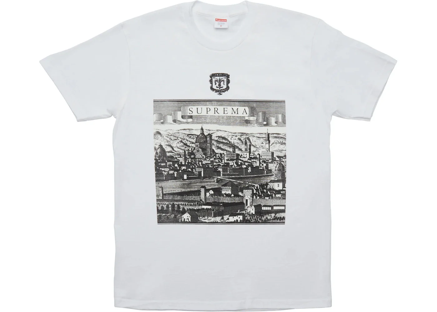 The Supreme Fiorenza Tee in White encapsulates a fusion of art, elegance, and streetwear aesthetics, showcasing meticulous design and premium construction. Crafted from soft cotton, the Supreme Fiorenza Tee White exudes comfort and quality, featuring a classic crew neckline and short sleeves for a relaxed fit. The tee boasts a detailed and elaborate greyscale print depicting a stunning cityscape intricately showcased across the chest. This print amalgamates artistic expression with Supreme's urban aesthetic, crafting an intriguing contrast between classical artistry and modern street culture. The subtle yet refined white backdrop allows the artwork to stand out vibrantly, adding depth and character to the tee's overall aesthetic. The wow factor of the Supreme Fiorenza Tee White lies in its detailed print showcasing the stunning cityscape in greyscale. We think this intricate and carefully crafted artwork melds classical artistry with streetwear culture, elevating the tee's visual appeal with its fusion of elegance and urban style. The tee retailed for $36 when it was released on the 29th of March 2018. - Season SS18 - Color White - Release Date 2018-03-29 - Retail Price 36 - Featured false