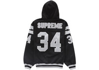 The Supreme Football Zip Up Hooded Sweatshirt Black is a poly fleece zip front hoodie in black with silver and white appliques. The number 34 and the Supreme logo in block letters adorn the back, and the number 34 decorates the sleeves and chest. Silver and white lightning bolts appear at the sleeve tops, complemented by white, silver, and black striped ribbed trim at the waist, cuffs, and inside the hood. Supreme branded woven label tags appear at the neck and hem. Iconic streetwear brand Supreme has never been afraid to reinvent its outward image, a practice the brand has honed for thirty years with its biannual collections. With the Football Zip Up, Supreme draws inspiration from American football and its players’ jerseys, which are known for their block lettering style. In our opinion, the best feature of the Football Zip Up is its black and silver colorway, which draws an association to storied NFL teams like the Raiders. The Supreme Football Zip Up Hooded Sweatshirt Black released on February 15, 2024, and retailed at $178. - Season SS24 - Color Black - Release Date 2024-02-15 - Retail Price 178 - Featured false - Requester Kelsey K - Uploaded By LL