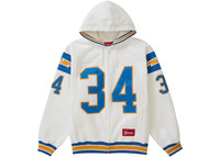 The Supreme Football Zip Up Hooded Sweatshirt White is a zip-front hoodie in poly fleece featuring blue appliques outlined in yellow. Appliqued on the front, back, and sleeves are the number "34" and the Supreme logo in block letters. Blue and yellow lightning bolt motifs are printed on the sleeve tops, coordinating with striped ribbed trim at the hood, waist, and cuffs. Supreme branding appears at the neck and front left hem. Skateboarding and streetwear powerhouse Supreme finds its design influences within many worlds, from cartoons to art to musicians. In 2024, Supreme pays homage to the aesthetic of American football, as rendered in the Football Zip Up, which showcases the sport’s block lettering and bold, graphic style. Our experts feel that the best feature of the Football Hooded Sweatshirt is its sporty vibe, which alludes to the sport without designating a certain team association. The Supreme Football Zip Up Hooded Sweatshirt White was released on February 15, 2024, and retailed at $178. - Season SS24 - Color White - Release Date 2024-02-15 - Retail Price 178 - Featured false - Requester Kelsey K - Uploaded By LL