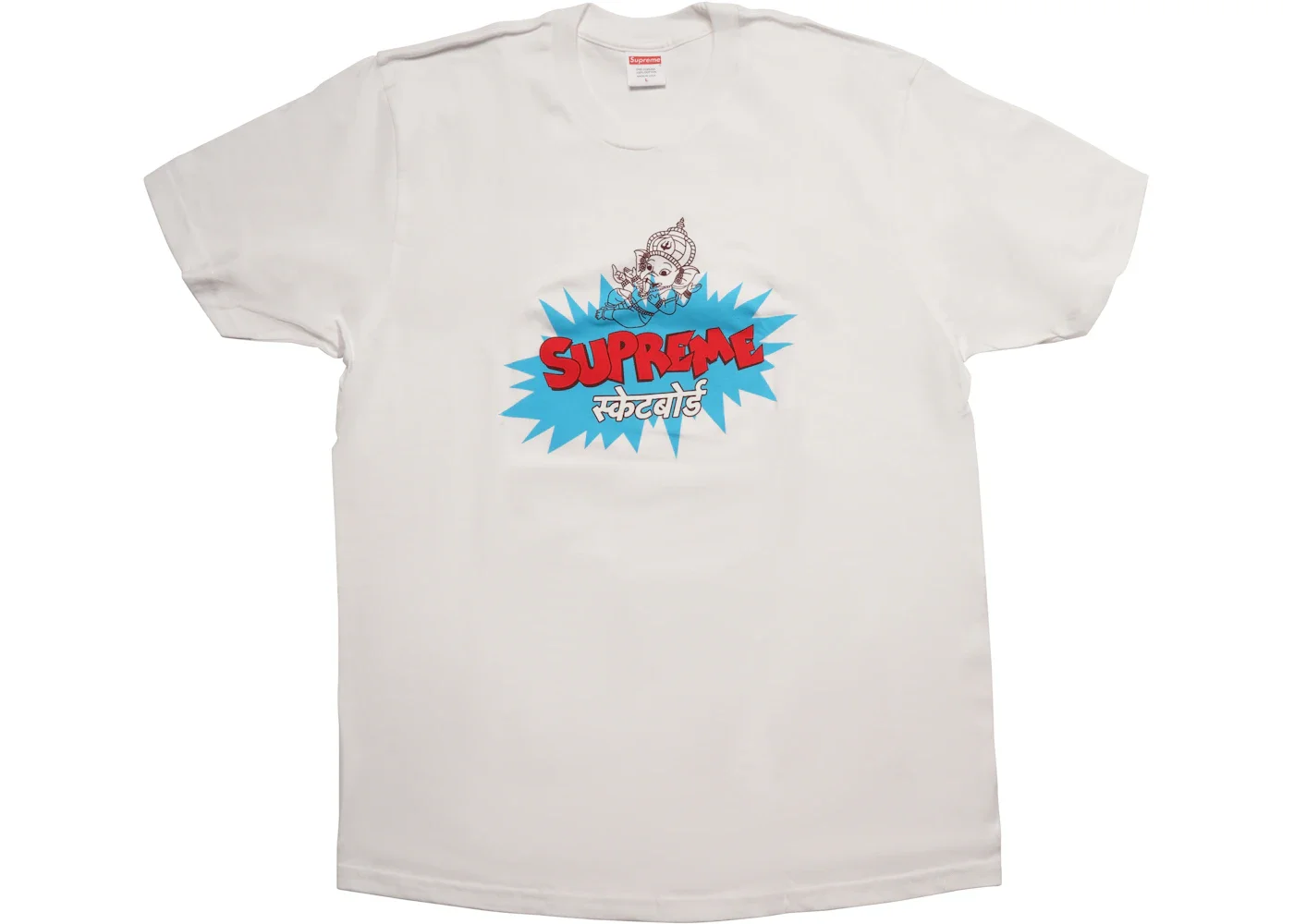 The Supreme Ganesha Tee White SS18 is a must-have for any streetwear enthusiast. This tee features a large graphic of the Hindu deity Ganesha on the front, with the Supreme logo printed above it. The white colorway gives the tee a clean and classic look, making it easy to pair with any outfit. Made from 100% cotton, this tee is comfortable and durable, ensuring it will last through multiple wears and washes. The release date for this tee was June 28th, 2018, and it retailed for $36. Something we love about the Supreme Ganesha Tee White SS18 is how it incorporates elements of Hindu culture into streetwear fashion. Our experts think the standout feature of this tee is the bold graphic of Ganesha, which adds a unique and eye-catching element to any outfit. Overall, we love the Supreme Ganesha Tee White SS18 for its blend of cultural references and classic streetwear style. - Season SS18 - Color White - Release Date 2018-06-28 - Retail Price 36 - Featured false
