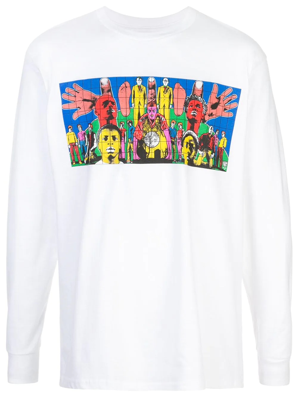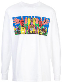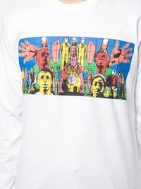 Gilbert & George T-shirt The Gilbert & George x Supreme Death Tee was released as part of the Spring/Summer 2019 collection. Pulling from a series called "1984 Pictures," bold colors are applied to a group of photographs developed in the 1970s. The long sleeve tee in white features a photomontage that highlights the artists themselves. The word "Death" tops the design with "Gilbert & George 1984" below it. A miniature Supreme block logo in red is subtly positioned below the graphic. Made in United States Composition Cotton 100% SIZE & FIT Model measurements Height 6 ft 2 in(1.88 m) Bust/Chest 38.2 in(97 cm) Hips 37 in(94 cm) Waist 29.9 in(76 cm)